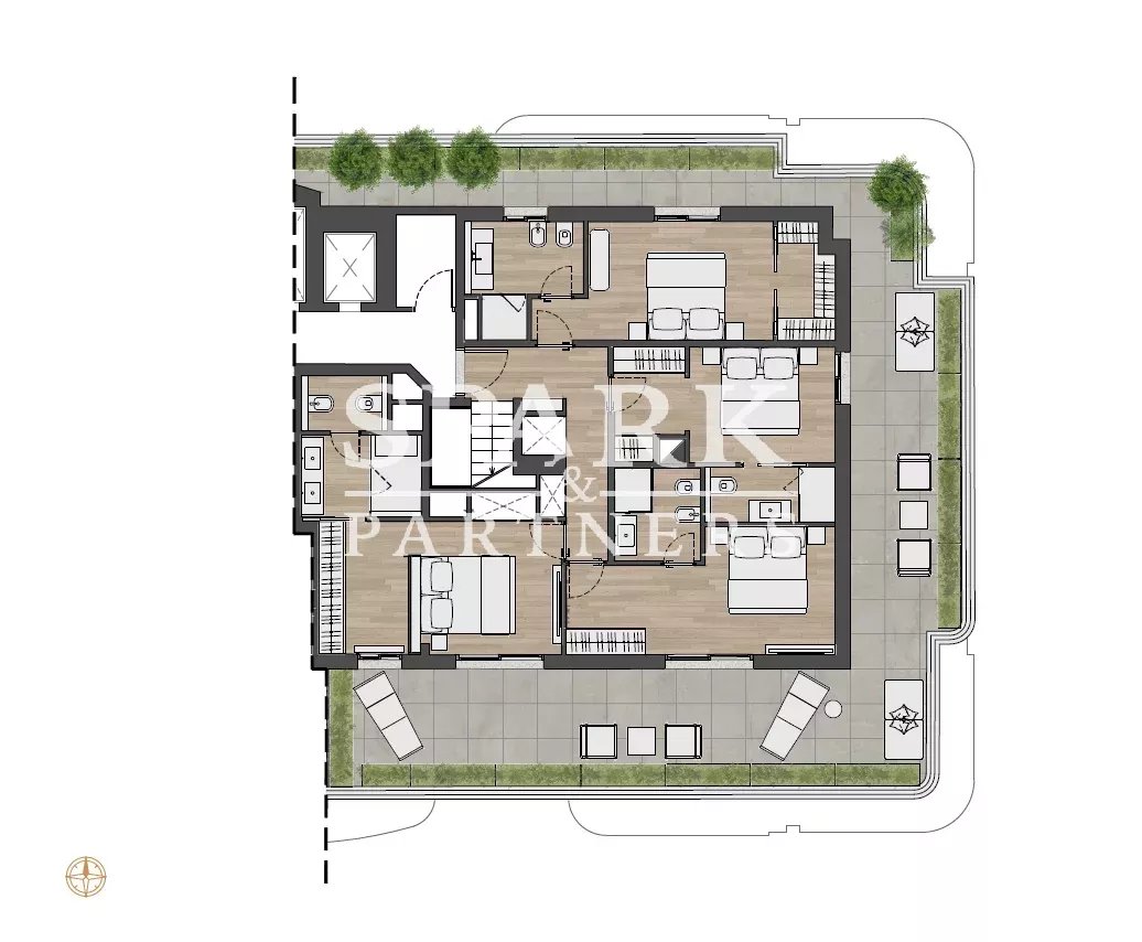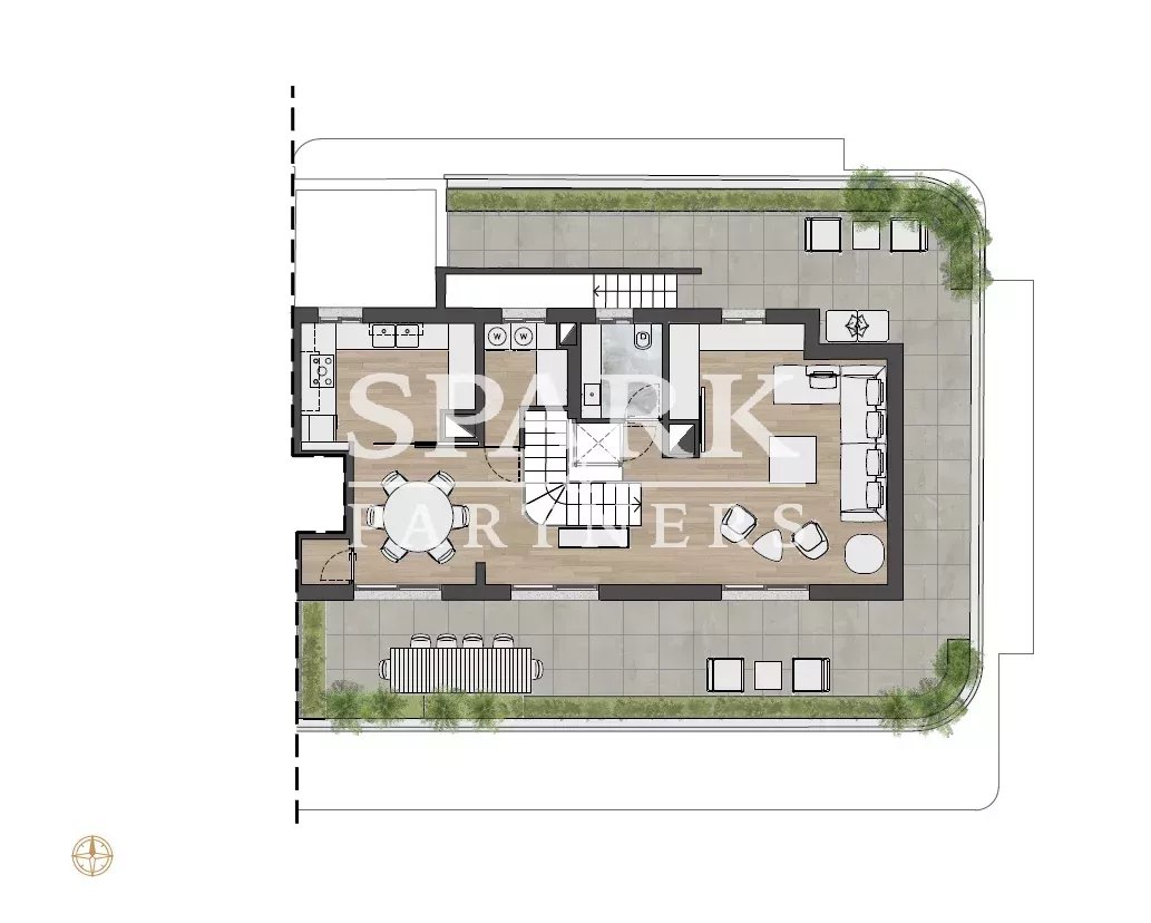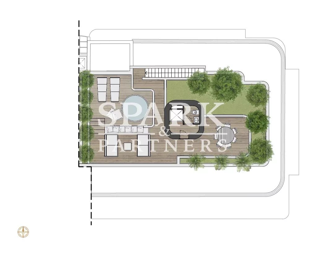 The roof terrace, accessible by elevator, features a lounge area and jacuzzi, ideal for enjoying the panoramic views.