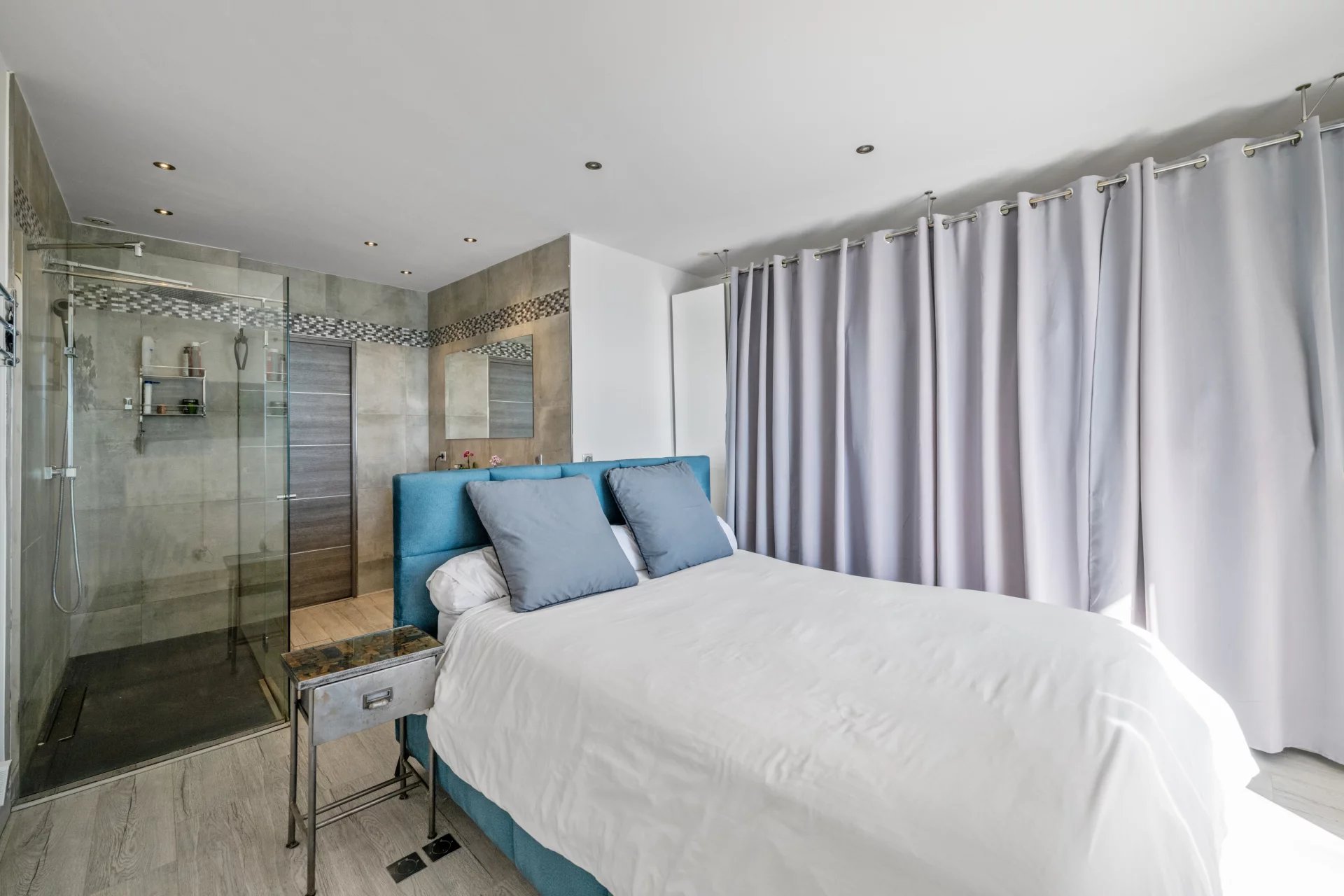 a master bedroom with a glass-enclosed shower integrated within the room and built-in storage,