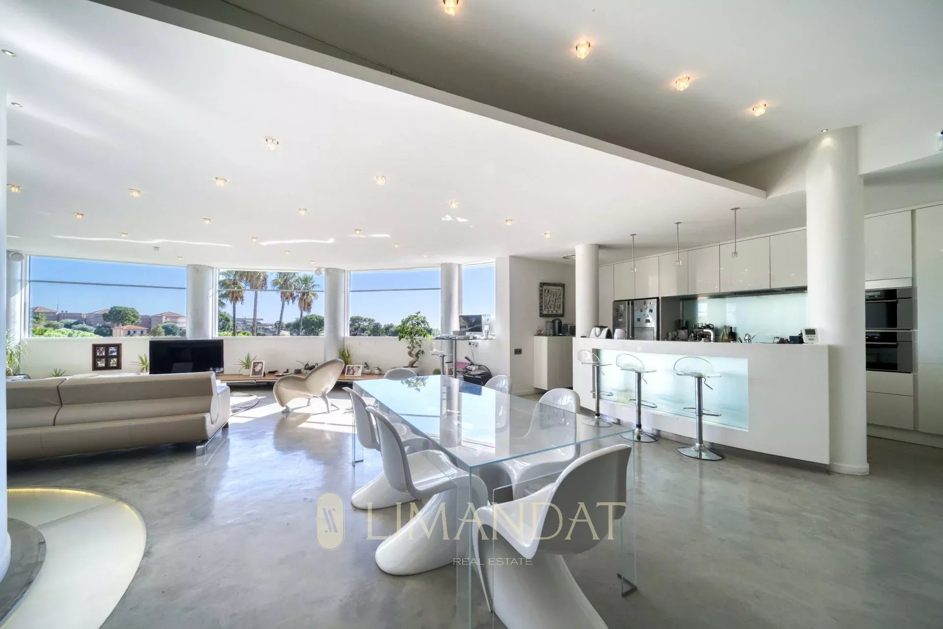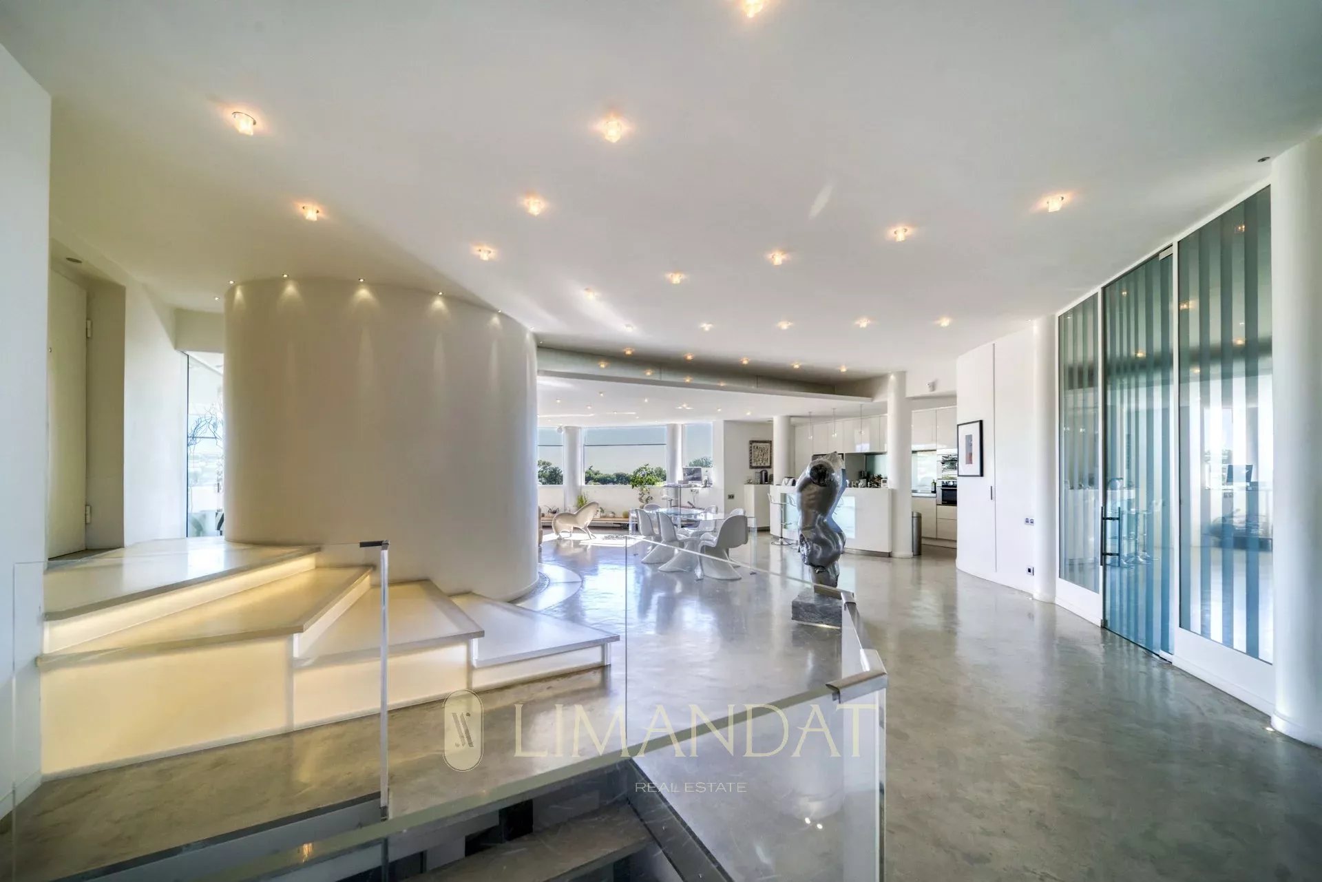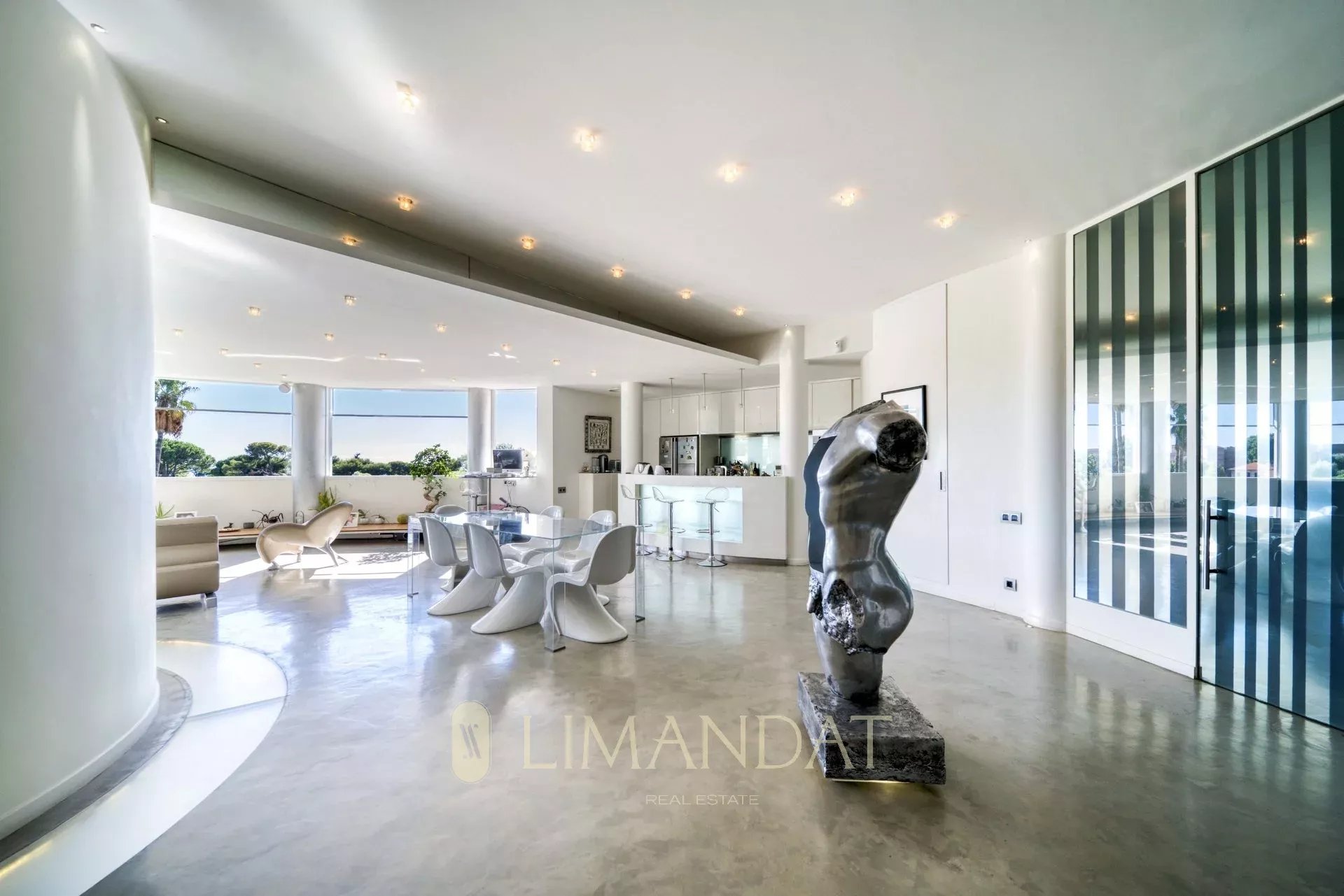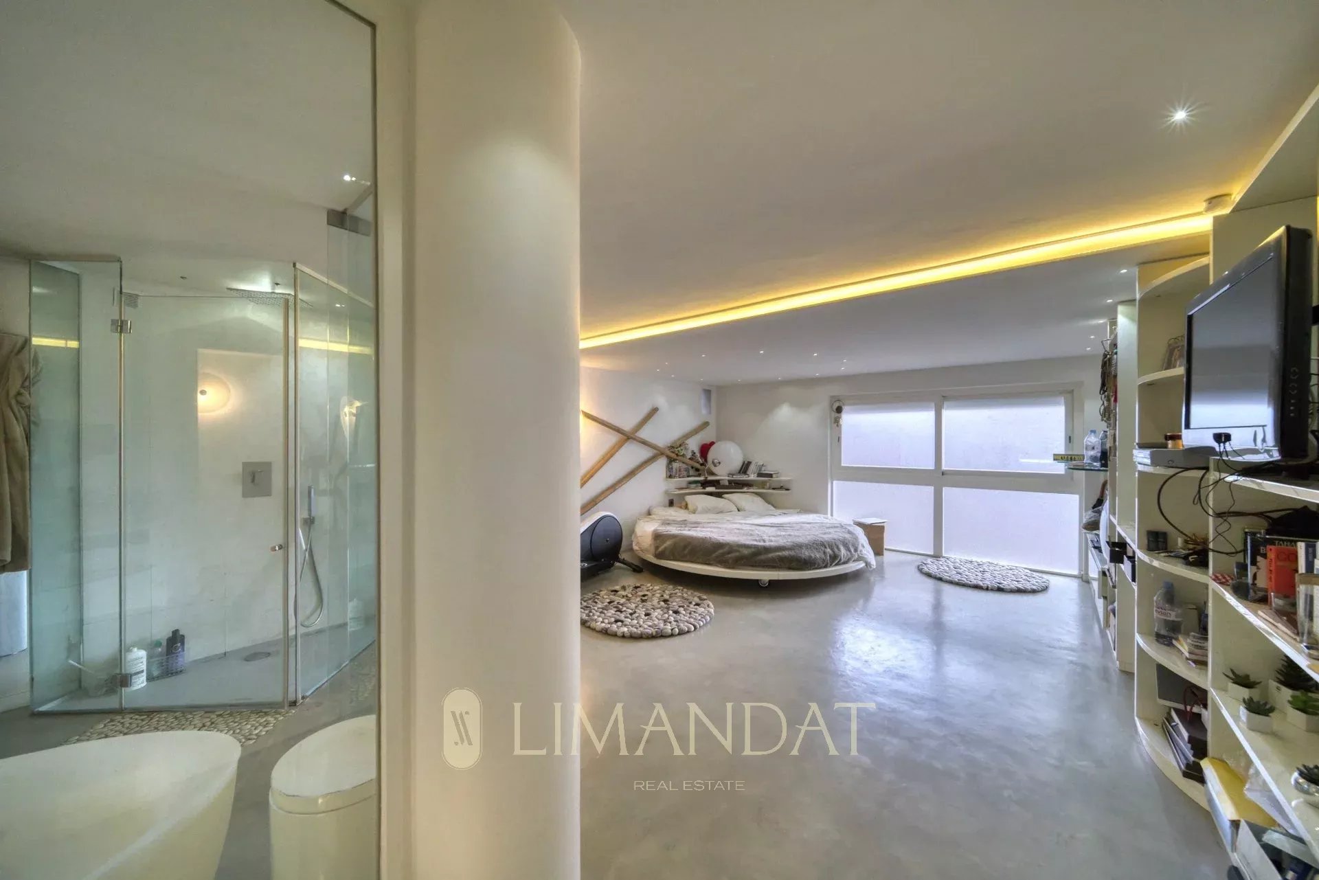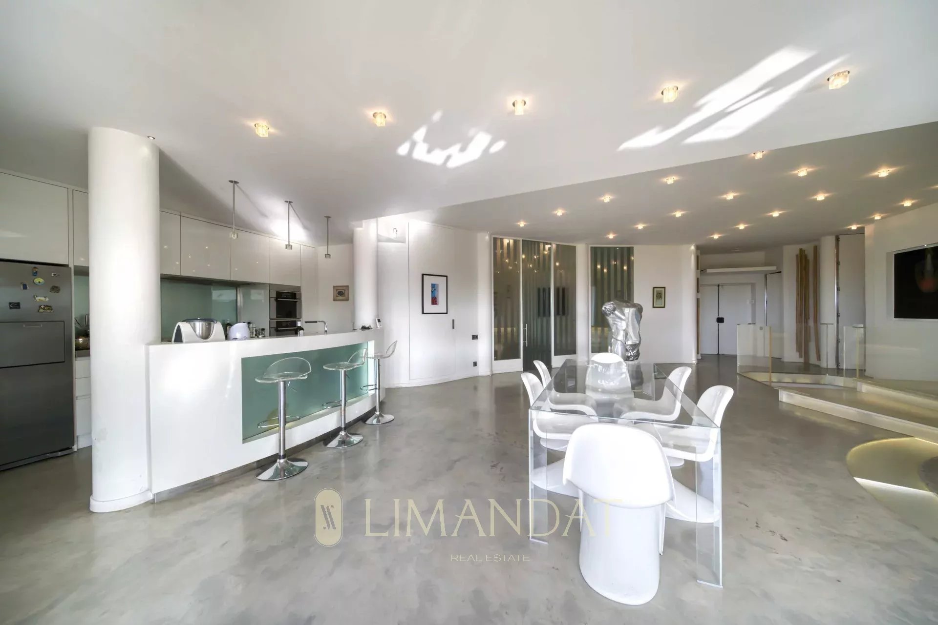 The apartment with generous volumes, in a contemporary style, consists of a huge living room of 120 m2 with fully equipped open kitchen, and large bay windows with a view of the residence's park and the sea, spa, master bedroom with bathroom. bathroom and dressing room, guest toilet.
