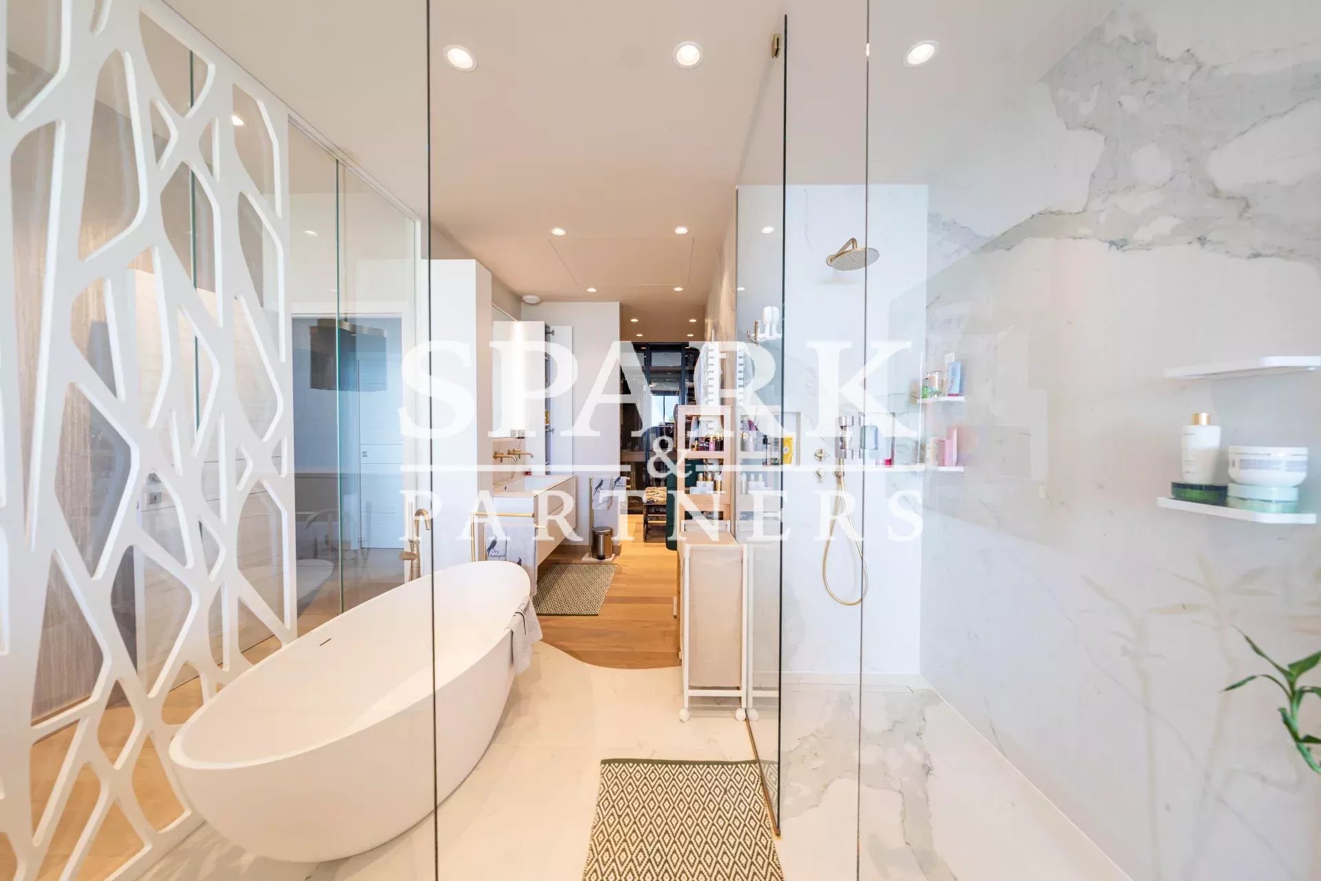 On the second floor: an elegant entrance leading to a vast living room with dining area, a modern kitchen, a bedroom with bathroom and toilet, and a sumptuous master suite with bathroom and dressing room. This level also includes a guest toilet, laundry room and private internal staircase to the garden level.