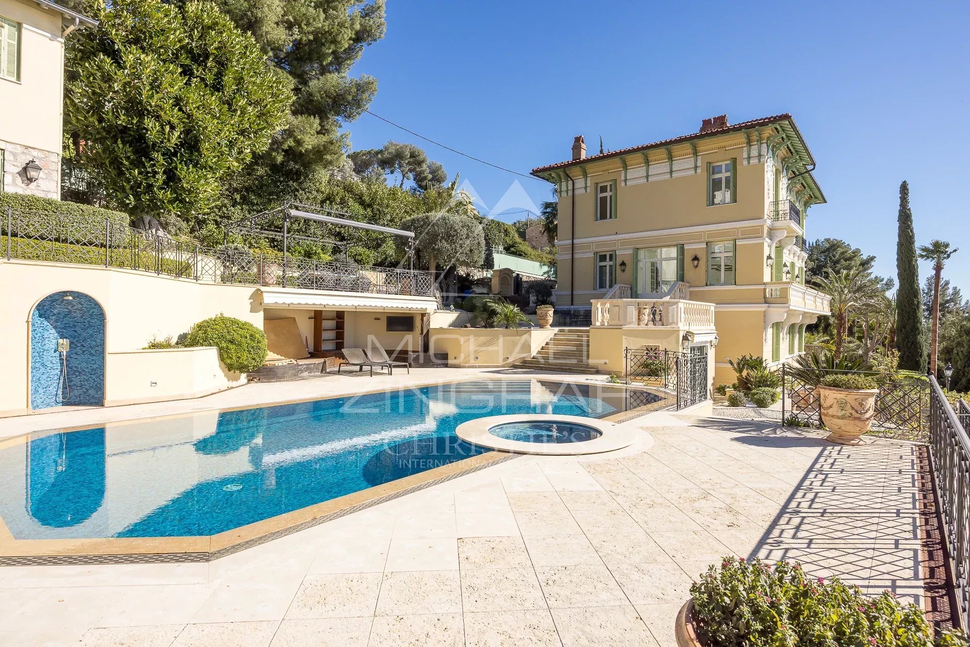 Just 10 minutes from the Principality of Monaco, in the heart of a peaceful and sought-after residential area, a sumptuous Belle Époque villa, recently renovated, nestled in a magnificent flat landscaped park of approximately 2,500 m² with a swimming pool and enjoying exceptional panoramic views of the sea and Monaco.