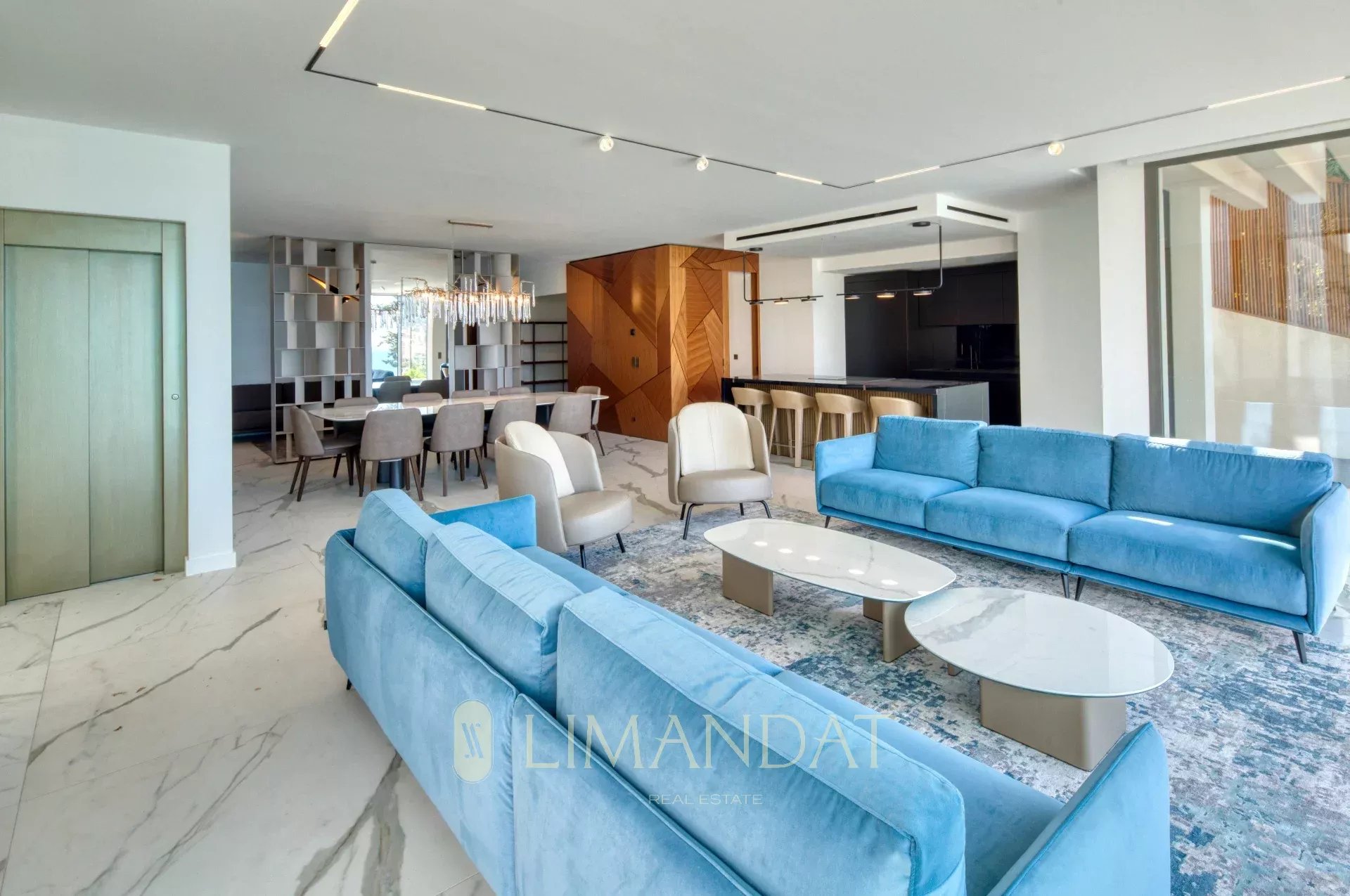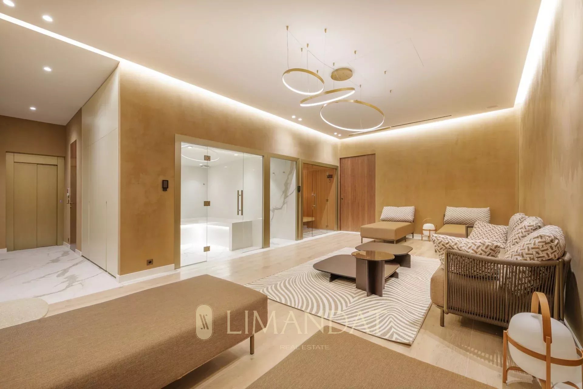 Spread over four levels connected by two elevators, the property is nestled in the heart of a landscaped Mediterranean garden of 900 m², featuring a heated infinity mirror pool, an outdoor jacuzzi, and a wellness area with spa, hammam, and sauna.