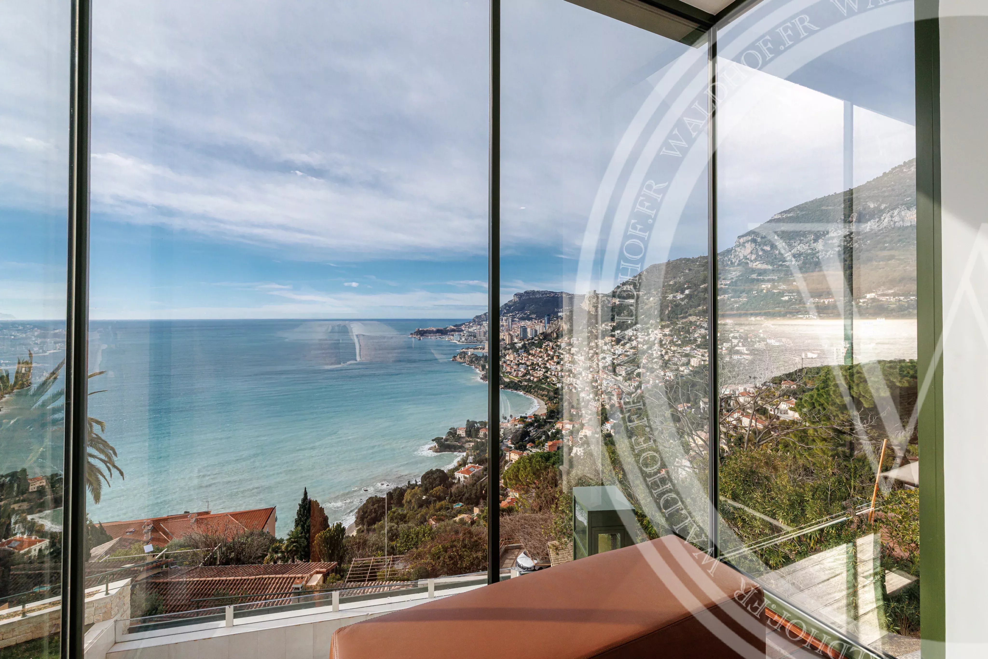 living room with panoramic sea view, large dining table, kitchen opening onto terrace and pool.