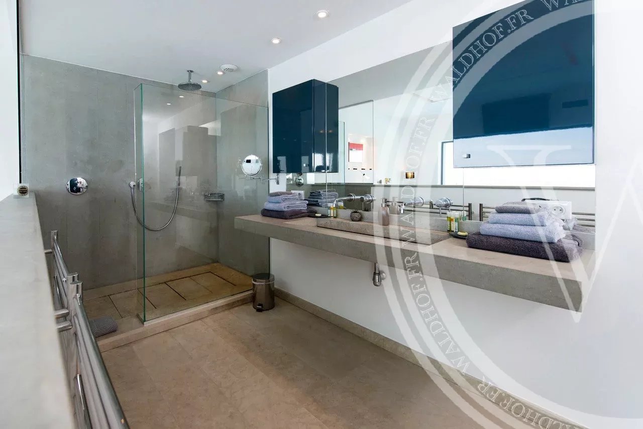 Cook like a pro in the summer kitchen with professional gas BBQ, and dine under the stars with ambient lighting and panoramic coastal scenery. The villa is fully air-conditioned, high-speed internet ready, and equipped with premium security: alarm system, digicode, and electric gates.