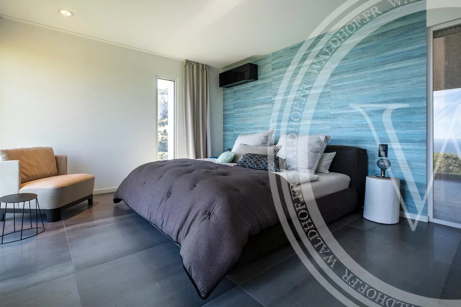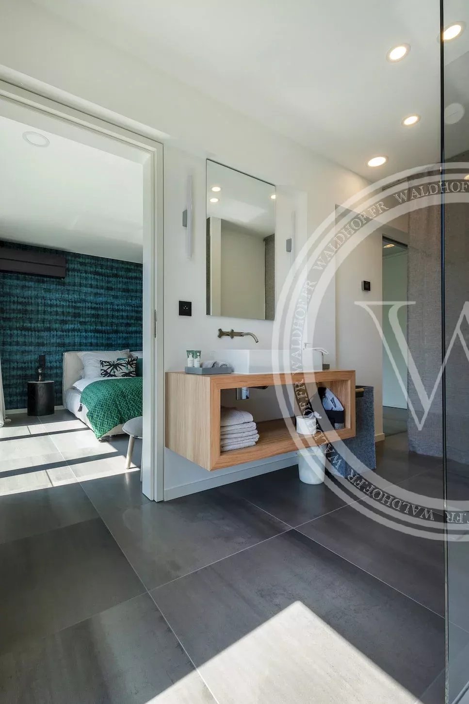 Built on three levels and served by a glass elevator, the property's contemporary elegance and top-of-the-range amenities are a delight. It includes a fully-equipped kitchen, a vast living room with dining area and large picture windows opening onto the sea, and five bedrooms, each with its own private bathroom.