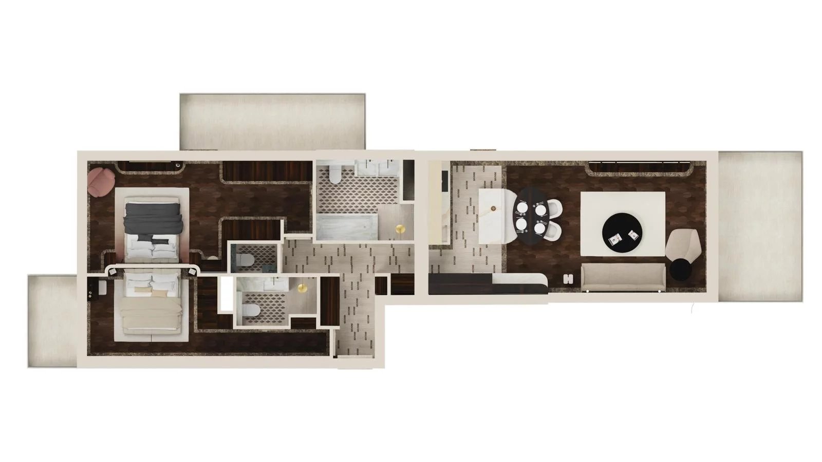 L'appartement jouit de belles vues sur la mer et les jardins et offre des espaces de vie généreux et lumineux. Il comprend deux chambres confortables, chacune dotée d'un balcon privé et d'une salle de bains privative, ce qui garantit l'intimité et le confort. La cuisine ouverte s'intègre parfaitement à l'espace de vie, qui s'ouvre sur un balcon supplémentaire, tandis qu'un WC pour les invités complète l'aménagement.