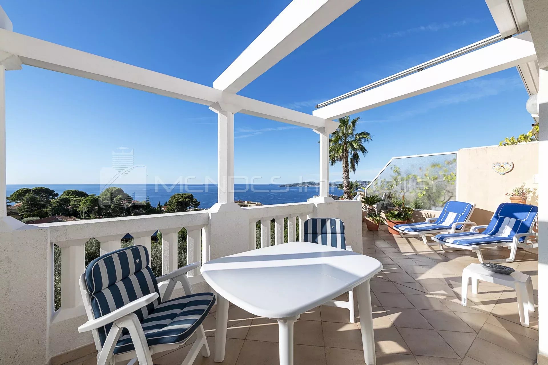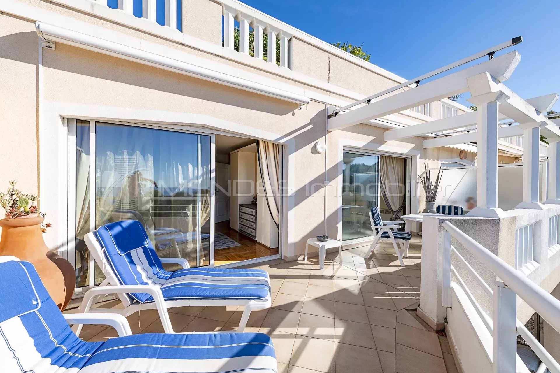 Superficie habitable de 85m2 + grande terrasse de 21m2 et se compose : d'un hall d'entrée, un séjour avec coin salle à manger ouvrant sur une terrasse, une cuisine équipée, une chambre avec vue mer et sa salle de bains avec toilette, une chambre, une salle de bains et un toilette invité.