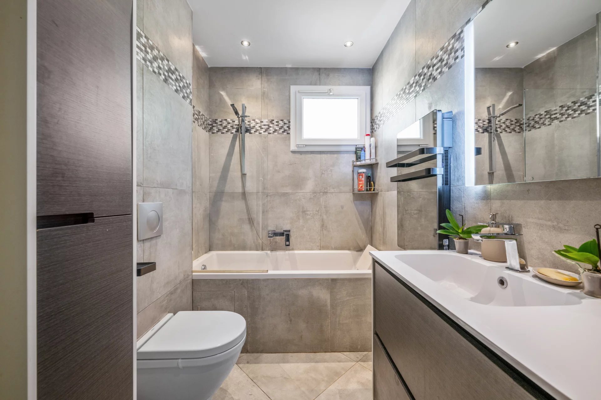 L’appartement situé au niveau inférieur développe environ 100 m² et se distingue par son caractère atypique et ses volumes généreux. Il comprend un vaste espace de vie avec cuisine ouverte, une grande chambre avec salle de douche, et s’ouvre sur un magnifique jardin privatif d’environ 90 m² ainsi qu’une terrasse couverte d’environ 15 m², véritable havre de paix.