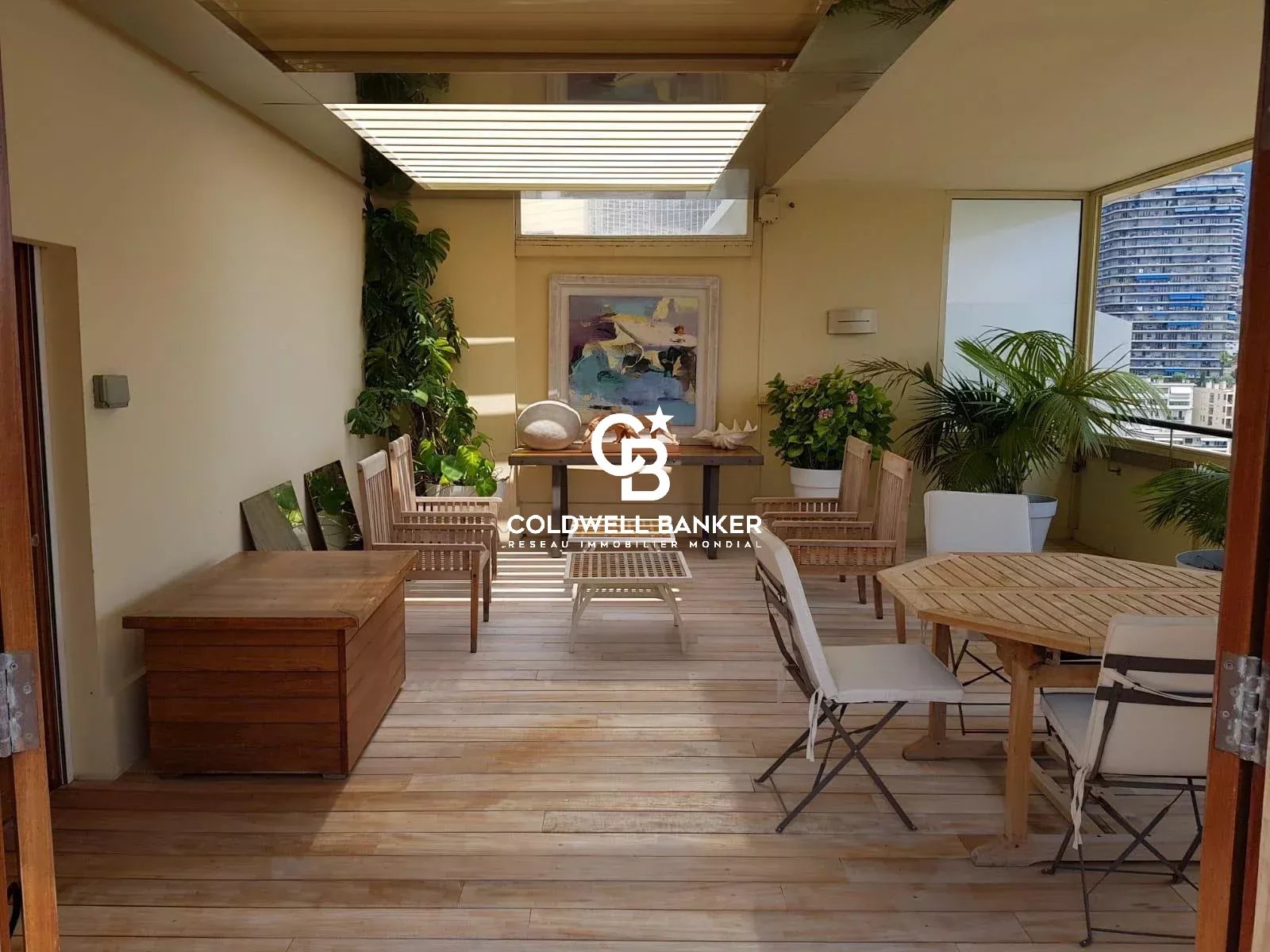 La cuisine est indépendante et entièrement équipée et donne sur les montagnes. La spacieuse chambre de Maître avec salle de bain attenante, a 2 expositions et offre des vues sur le Palais Princier et et également sur les montagnes. Un bel escalier en teck mène à l'étage supérieur où se trouve une loggia baignée de soleil et offrant une vue imprenable sur le Port et la mer. Elle est entourée d'une magnifique terrasse avec véranda. L'espace et les différentes perspectives en font un lieu unique pour l'organisation de réceptions singulières. Le prix inclut 2 chambres de bonnes et un emplacement de parking.