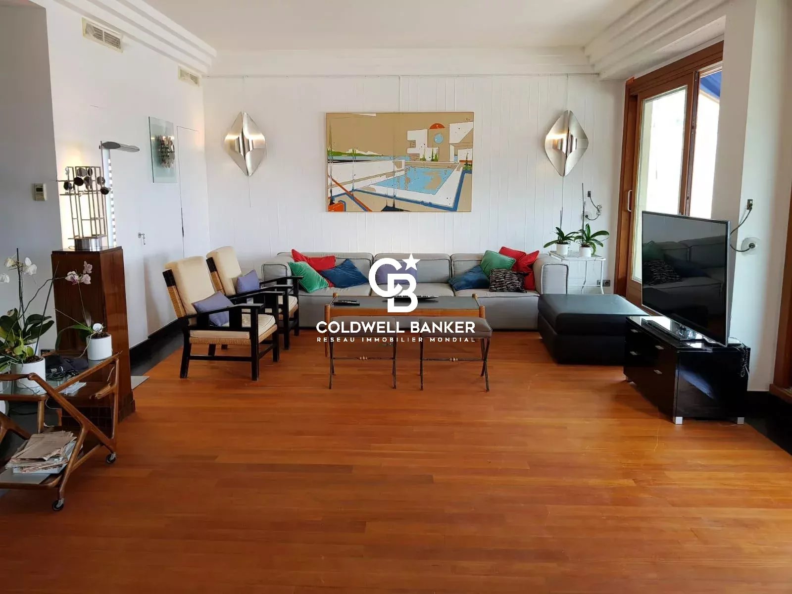 Situé sur les 2 derniers étages de la résidence, le spacieux duplex domine le Port dévoilant un panorama unique et exceptionnel sur le Port, la mer, ainsi que le Rocher et les montagnes grâce à ses 3 expositions. Au premier niveau, se trouve un grand et lumineux séjour décoré de teck . Sur la droite, des portes coulissantes du même bois permettent d'accéder à un grand espace bureau pouvant être converti en chambre. Ces 2 pièces s'ouvrent sur la même terrasse avec vue Port et mer.