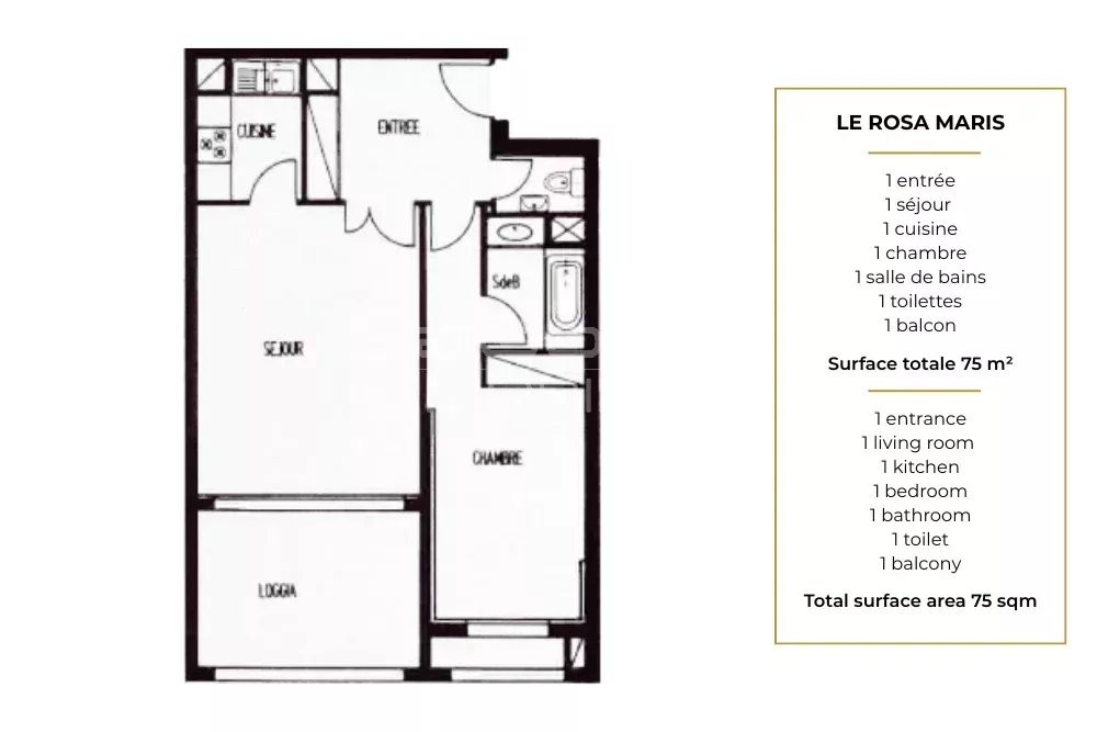 Il se compose d'une entrée avec placards, de toilettes séparés, d'une cuisine équipée séparée ouvrant sur un séjour lumineux, d'une salle de bains, d'une chambre confortable et d'une spacieuse loggia.