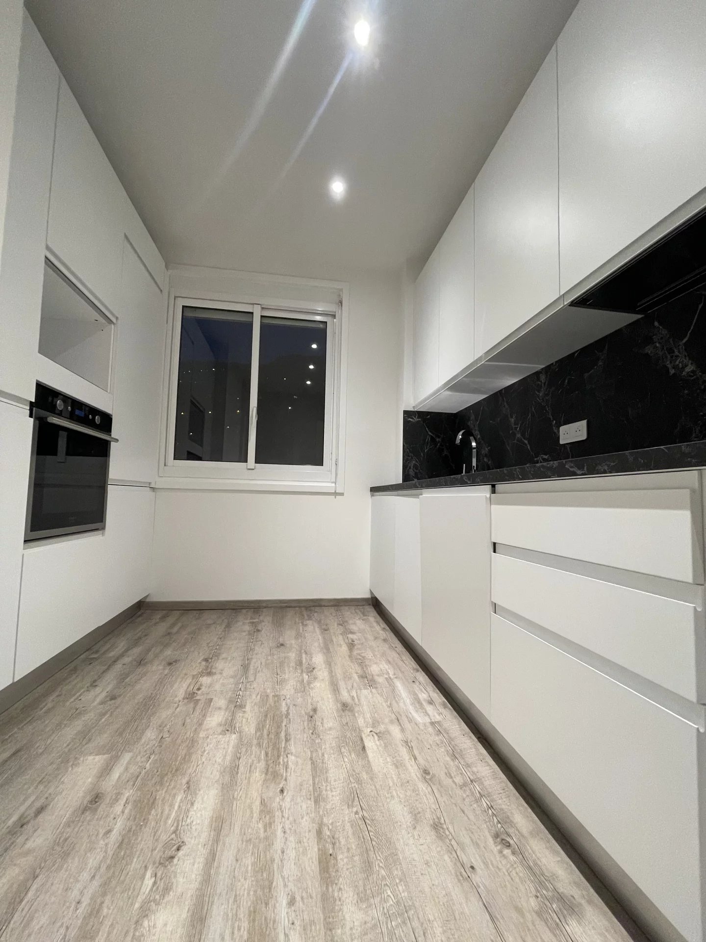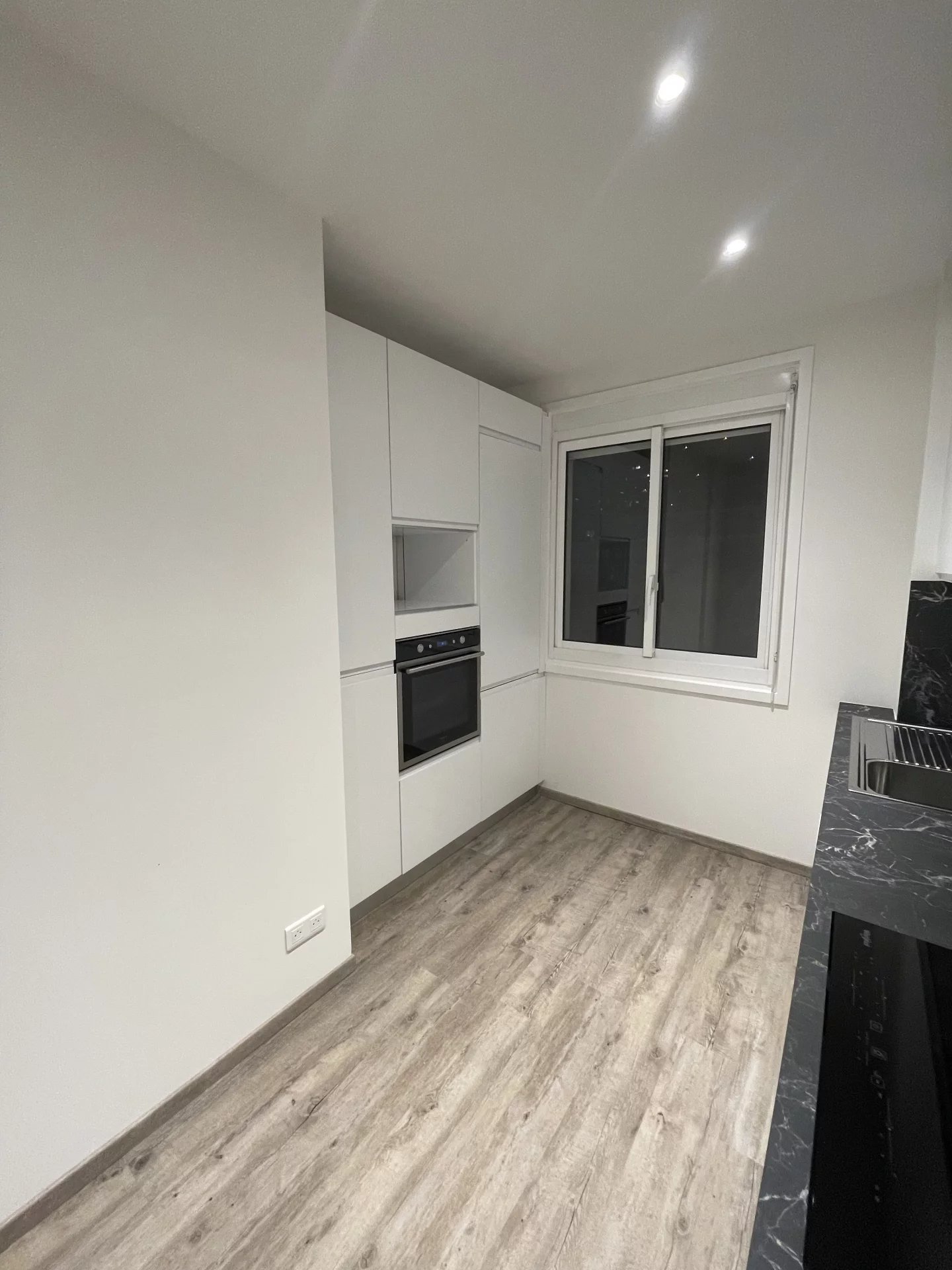 hall avec placard, cuisine équipée neuve, séjour, chambre, salle de douche neuve avec wc et fenêtre.