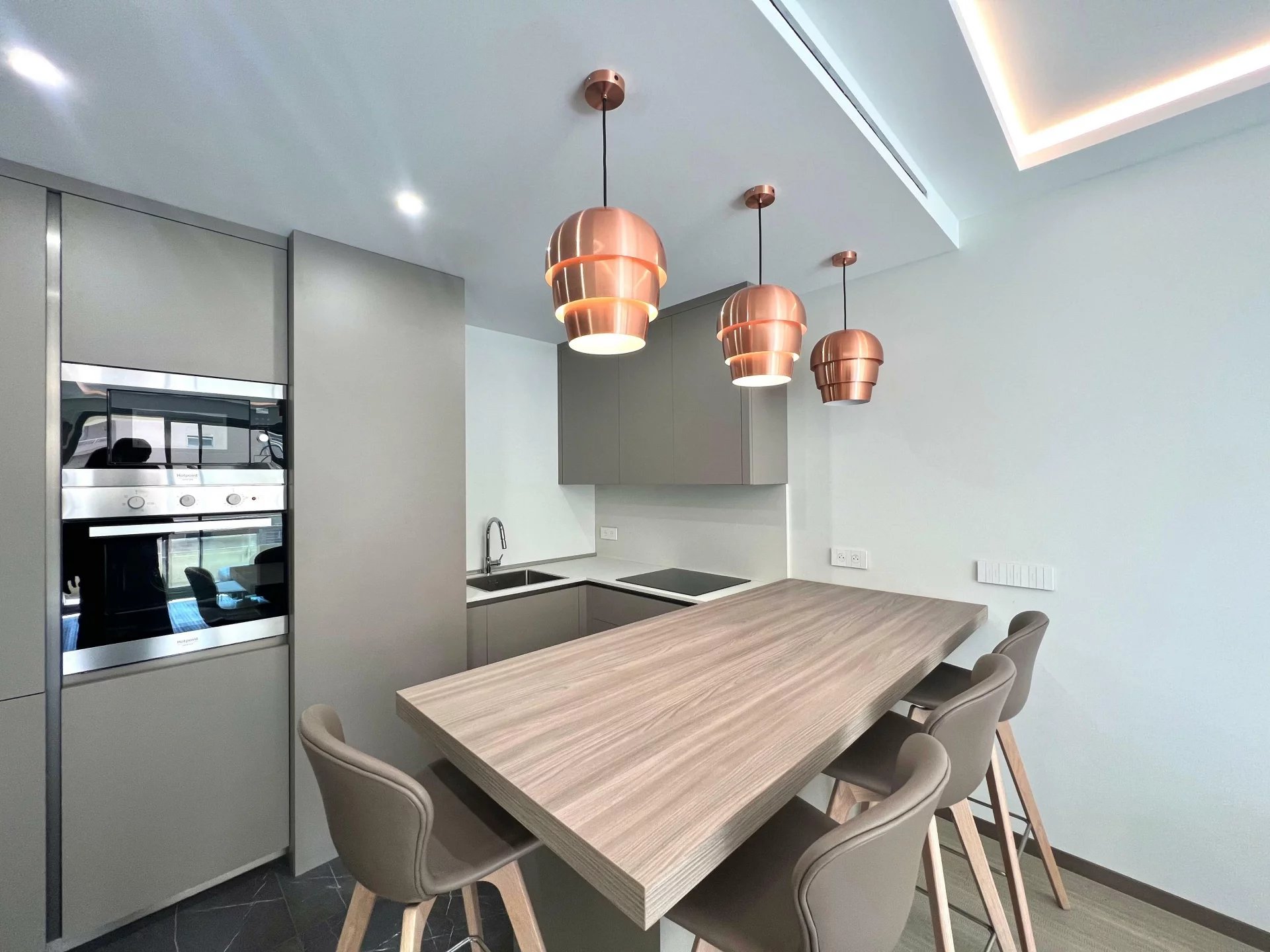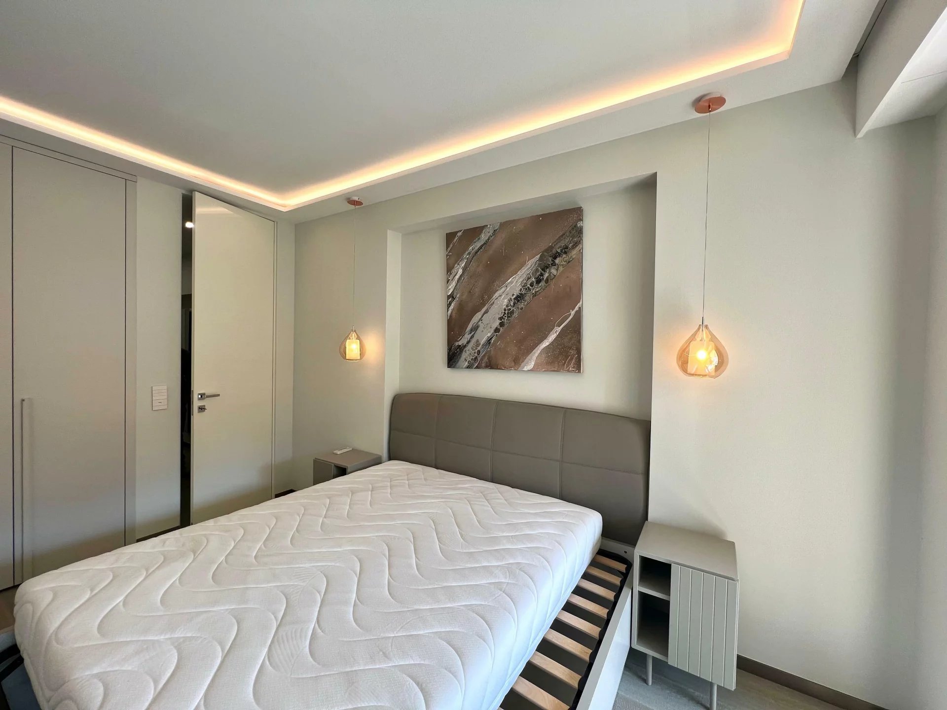 Cet appartement entièrement rénové dispose d'un salon spacieux et lumineux avec une cuisine ouverte et un coin bar. La chambre, équipée d'armoires encastrées, s'ouvre également sur une généreuse terrasse, offrant un espace extérieur paisible. L'appartement comprend également une salle de douche moderne et des toilettes pour les invités avec un lavabo.
