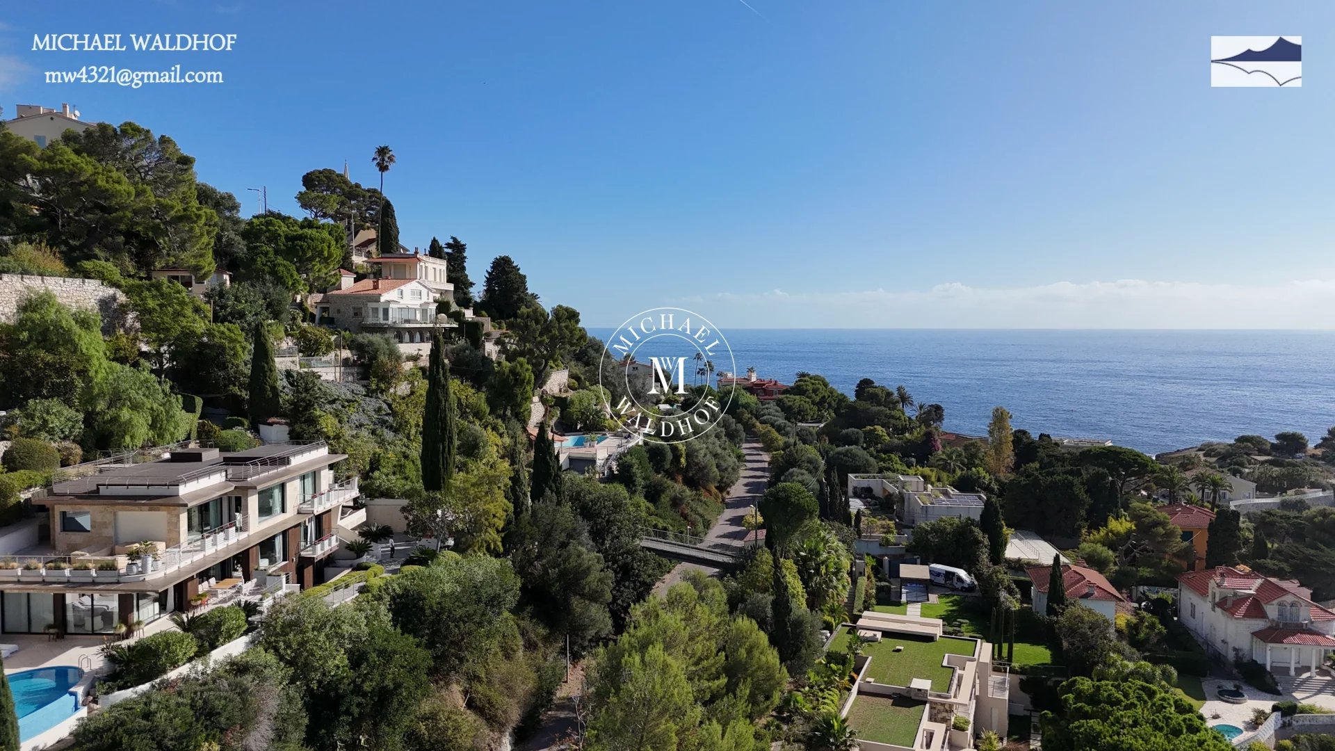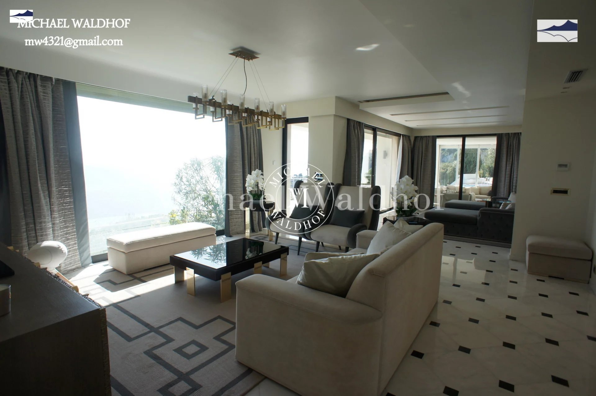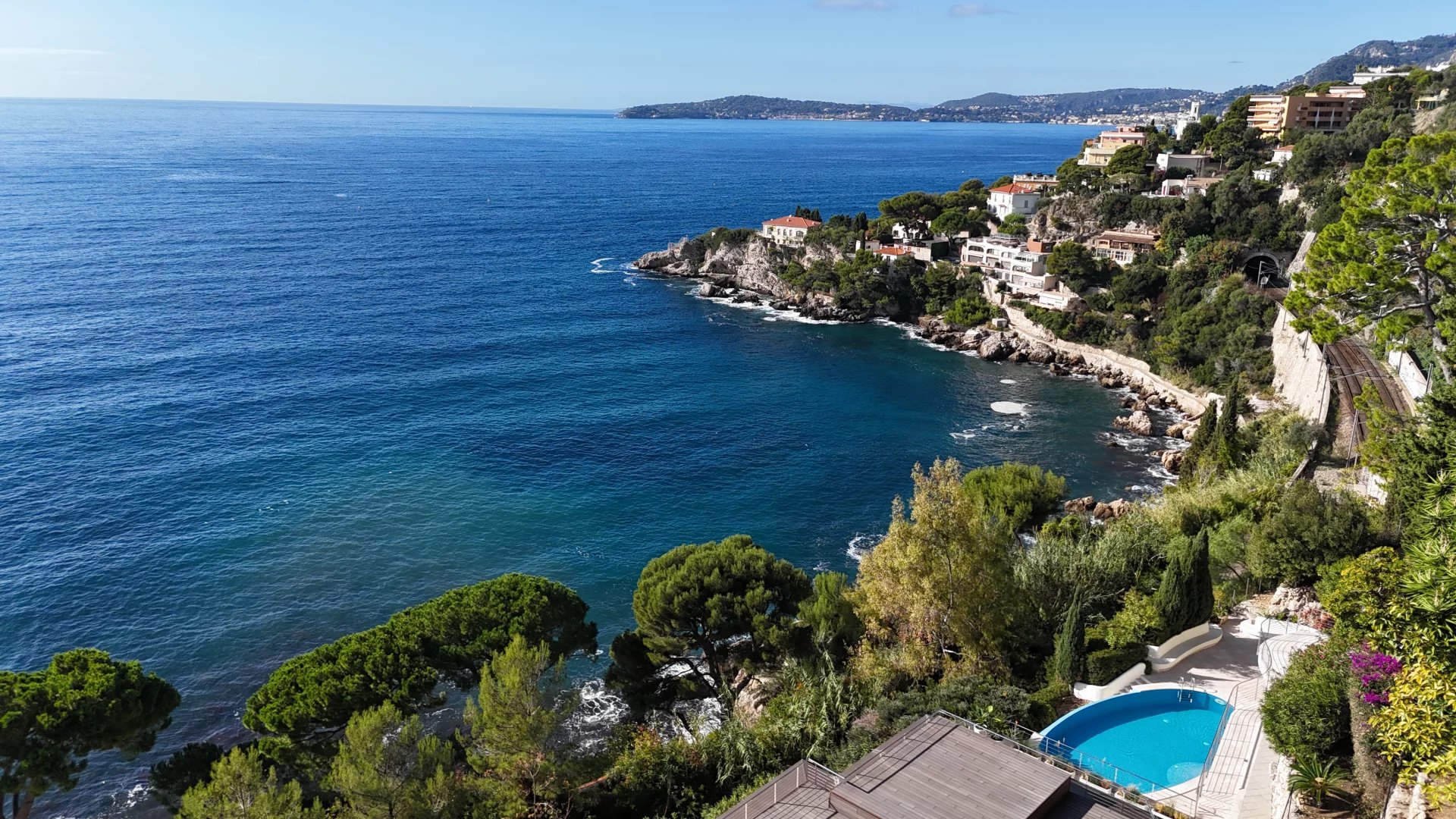 Monaco - Cap d Ail villa moderne aux lignes épurées, salon de 100 m² avec mobilier moderne et vue panoramique, 5 chambres avec vue sur la mer, cuisine équipée ultramoderne, appartement séparé pour le personnel de maison, piscine avec vue sur la mer, garage pour 2 voitures, la mer à 300 mètres est accessible à pied en 2 minutes, à 5 minutes en voiture de la vie trépidante de la Principauté de Monaco.