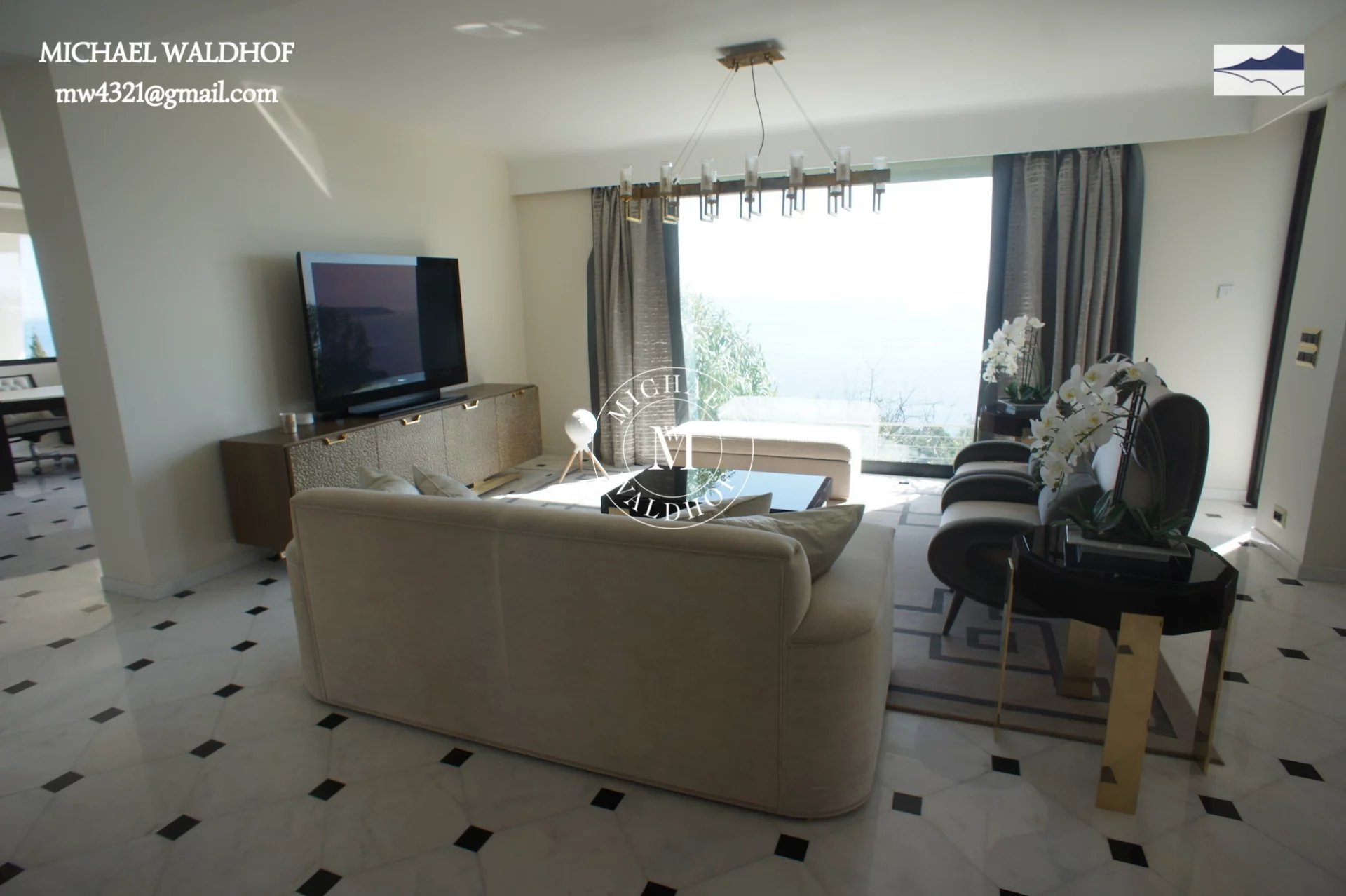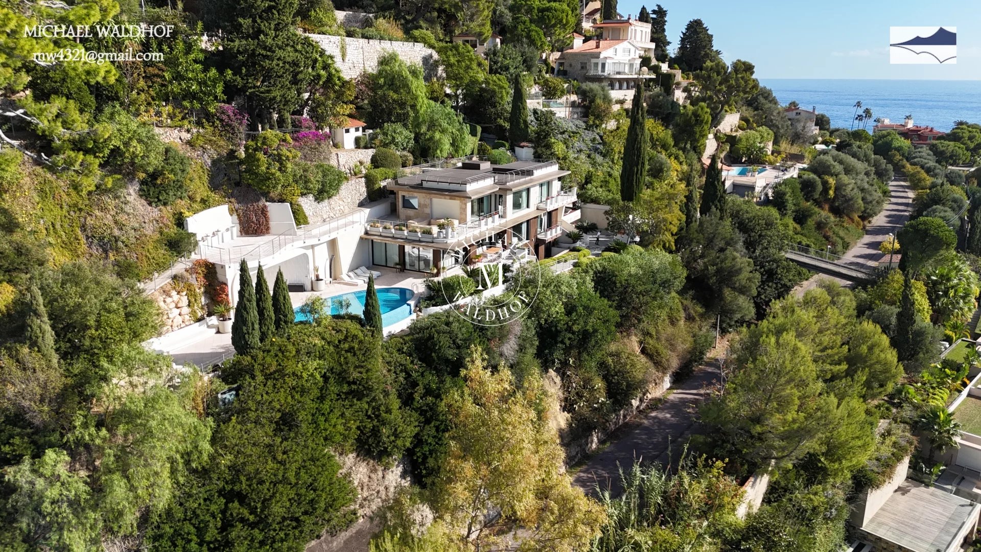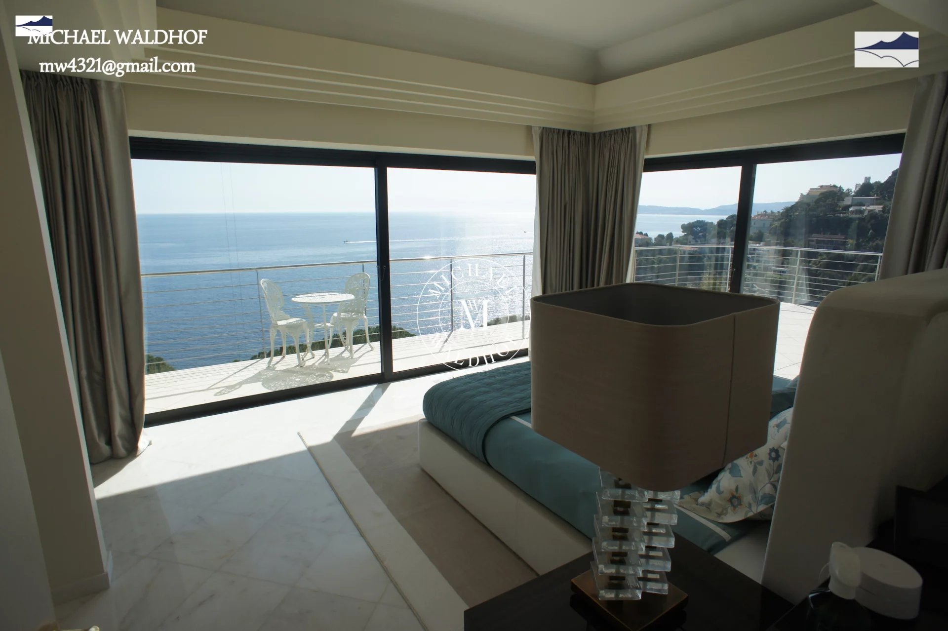 Monaco - Cap d Ail villa moderne aux lignes épurées, salon de 100 m² avec mobilier moderne et vue panoramique, 5 chambres avec vue sur la mer, cuisine équipée ultramoderne, appartement séparé pour le personnel de maison, piscine avec vue sur la mer, garage pour 2 voitures, la mer à 300 mètres est accessible à pied en 2 minutes, à 5 minutes en voiture de la vie trépidante de la Principauté de Monaco.