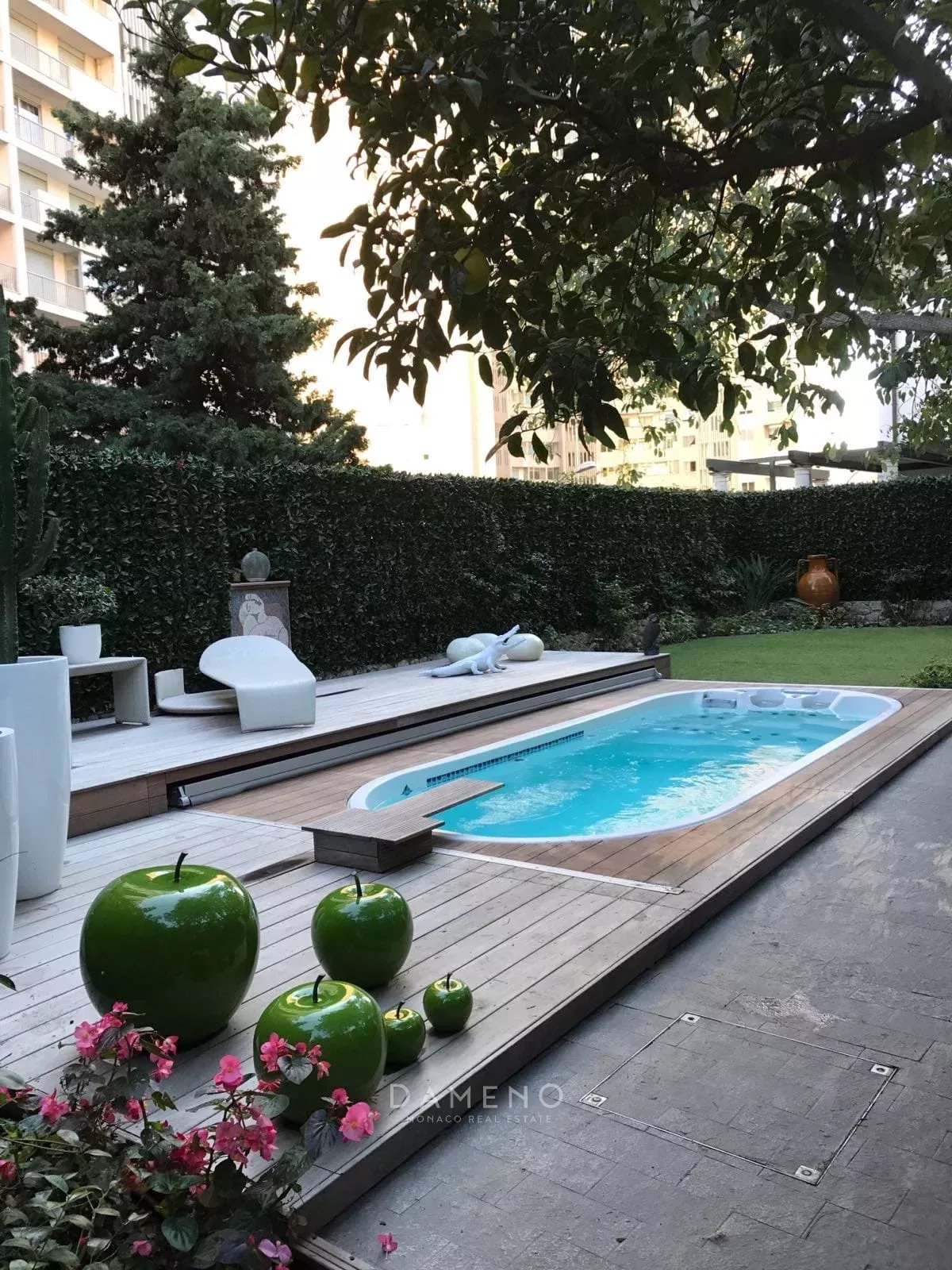 Le jardin d'une surface de 700 m2 bénéficie d'une piscine chauffée et d'un coin repas avec cheminée.