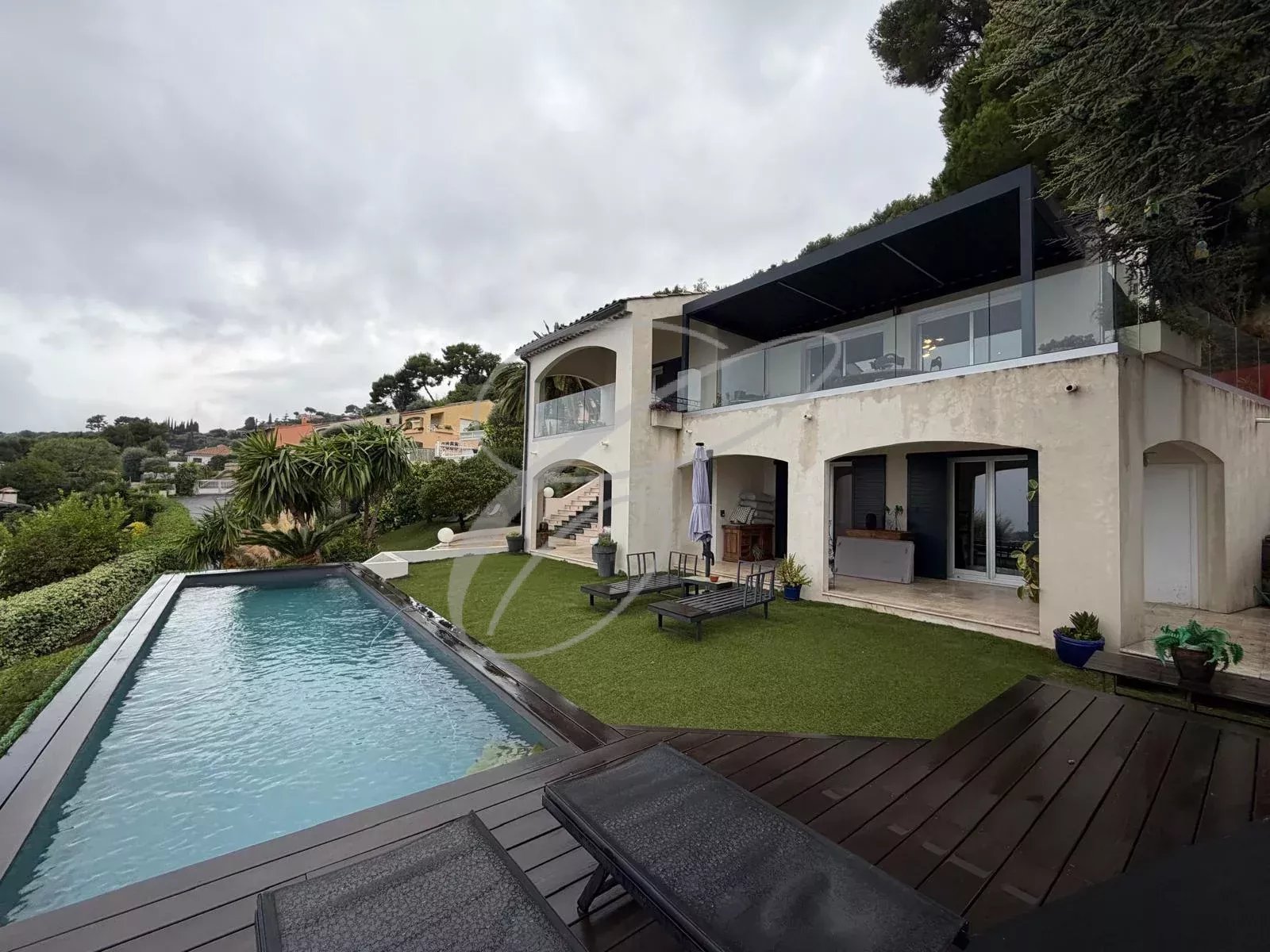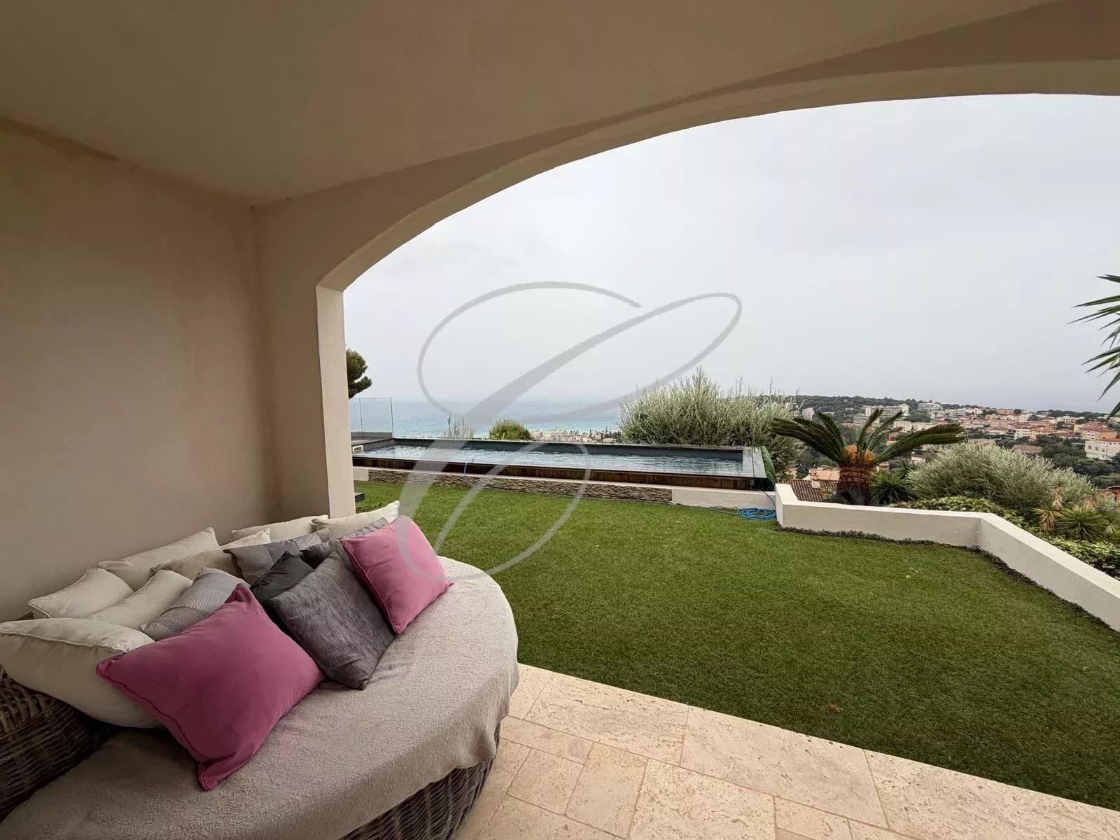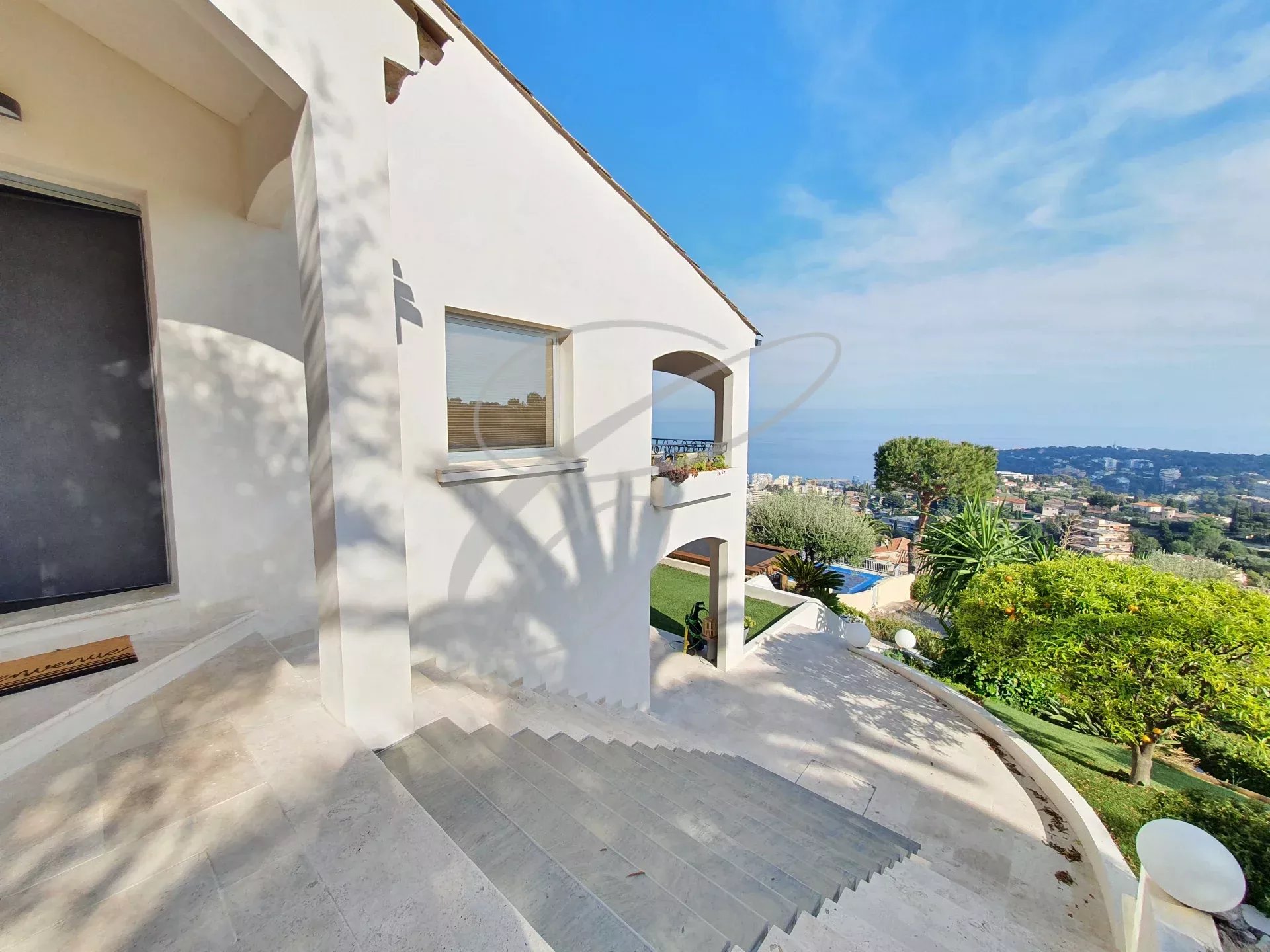 Domaine résidentiel dans le Hameau de Roquebrune, villa complètement rénovée de 6 pièces principales au cœur d'un jardin d'environ 1.155 m² avec piscine. Vue mer panoramique sur le Cap Martin. Villa composée d'un grand salon, salle à manger, cuisine US équipée, 4 chambres, 3 salles de bains, mezzanine. Garage fermé avec permis de construire accordé pour l'agrandir.
