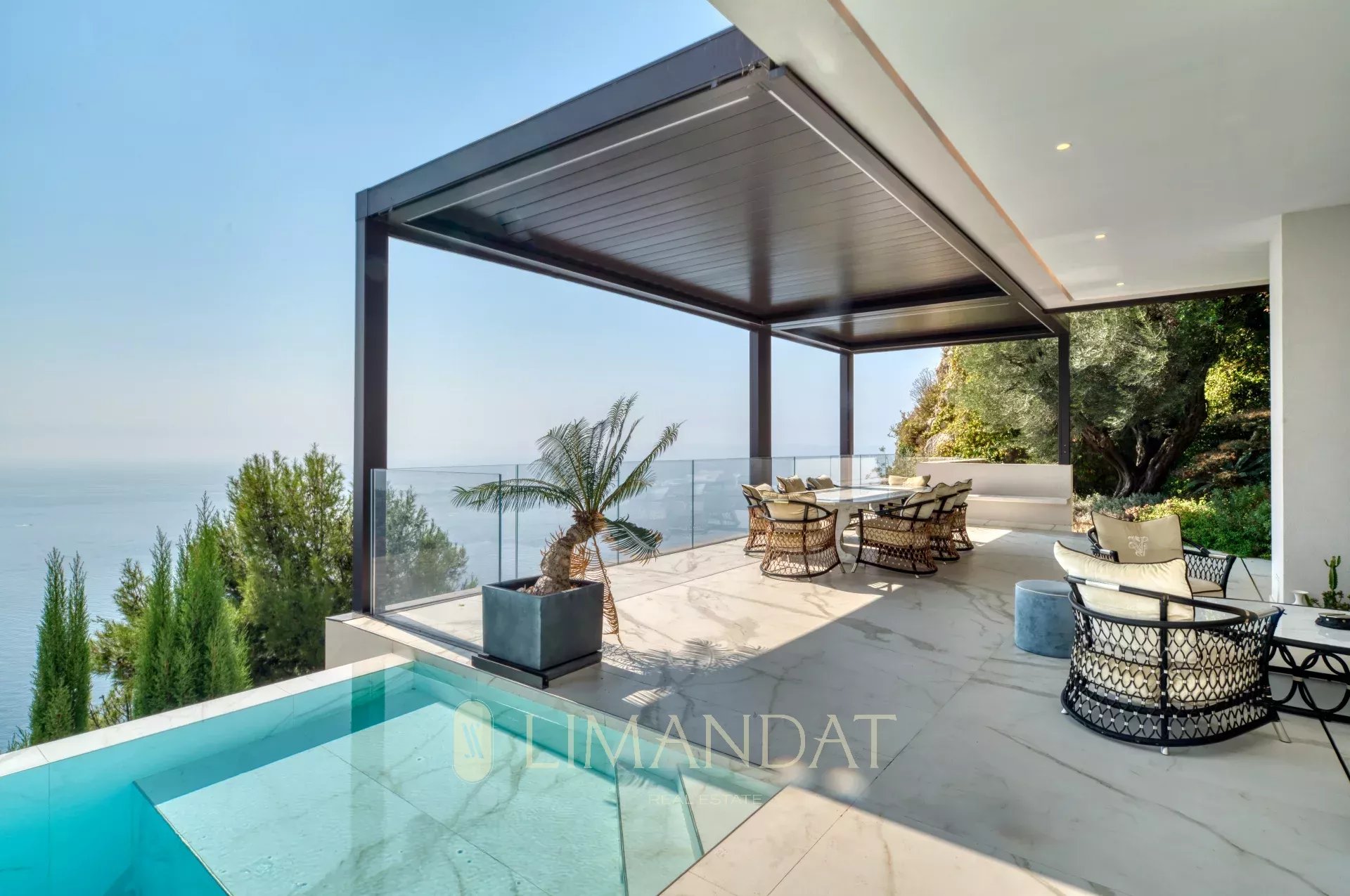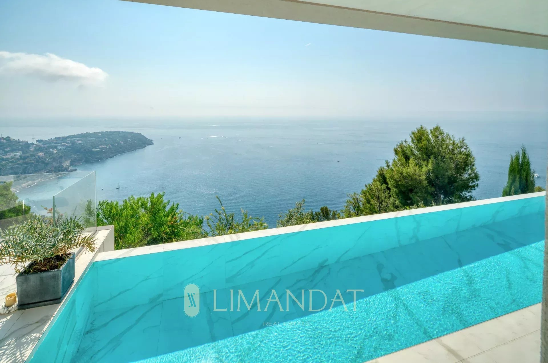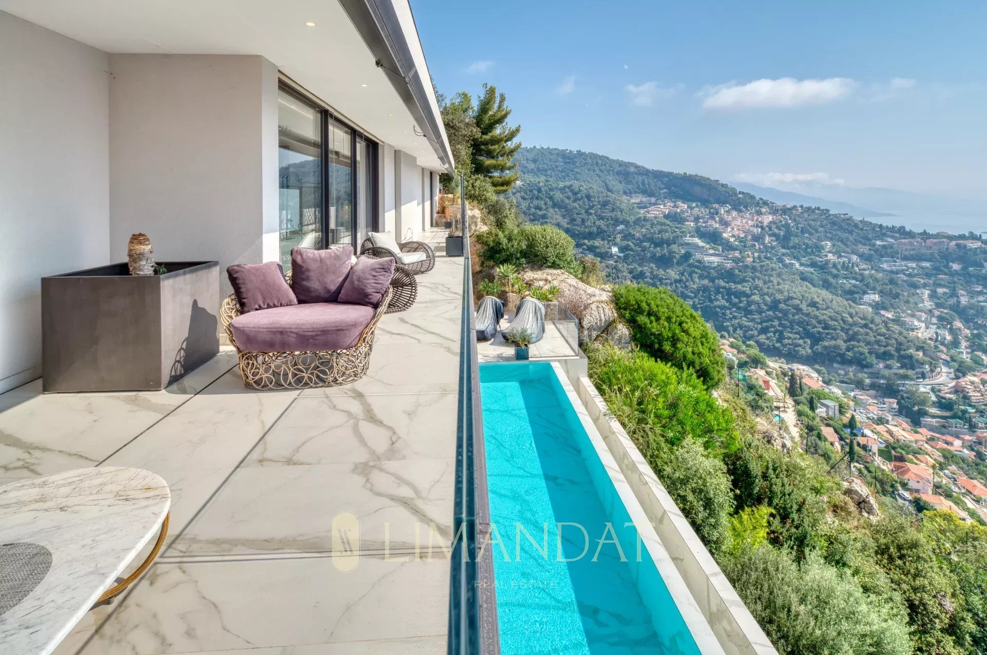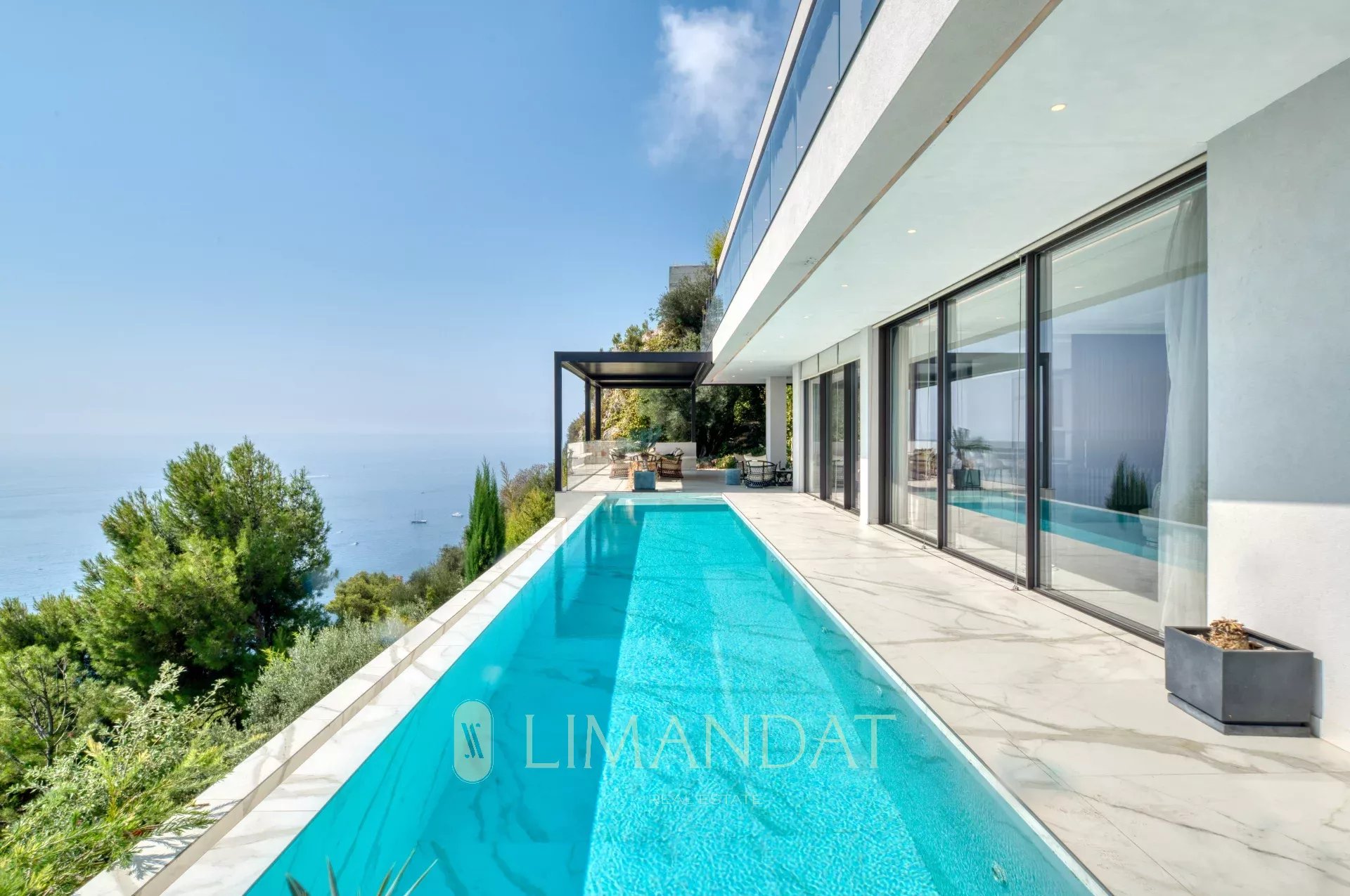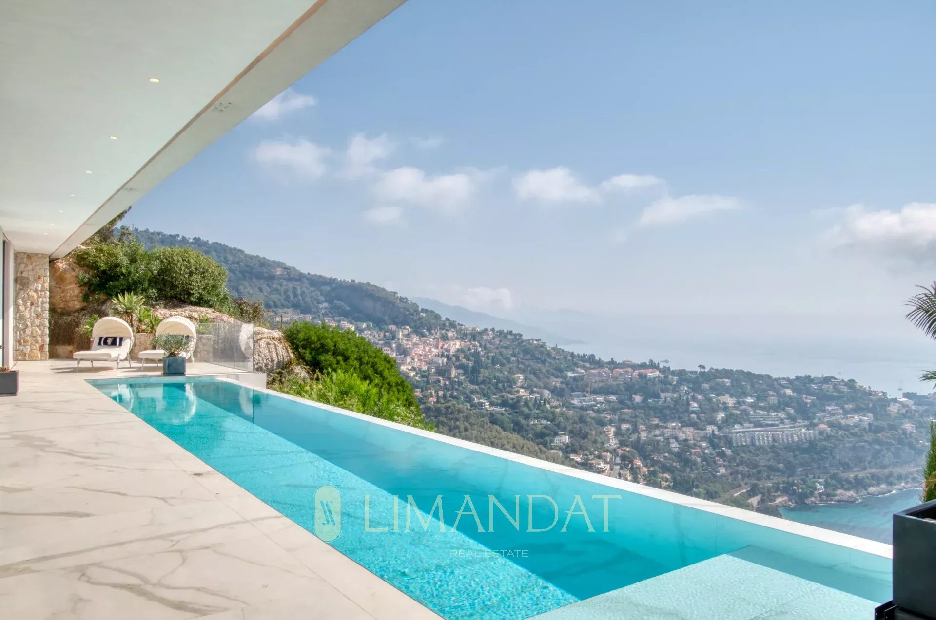 ROQUEBRUNE-CAP-MARTIN, à 5 minutes de Monaco, au calme, vue panoramique à 180°, somptueuse propriété d’une surface habitable de 570 m2 édifiée sur terrain paysager de 3 780 m2, grand garage, parkings, et piscine à débordement chauffée. La villa au style contemporain et larges baies vitrées, aux finitions haut de gamme se décline sur 3 niveaux facilement accessibles par ascenseur. Elle se compose de 7 chambres toutes en suite et 8 salles de bains, avec de nombreux espaces détente, salle de sport, jacuzzi, sauna, Hammam.