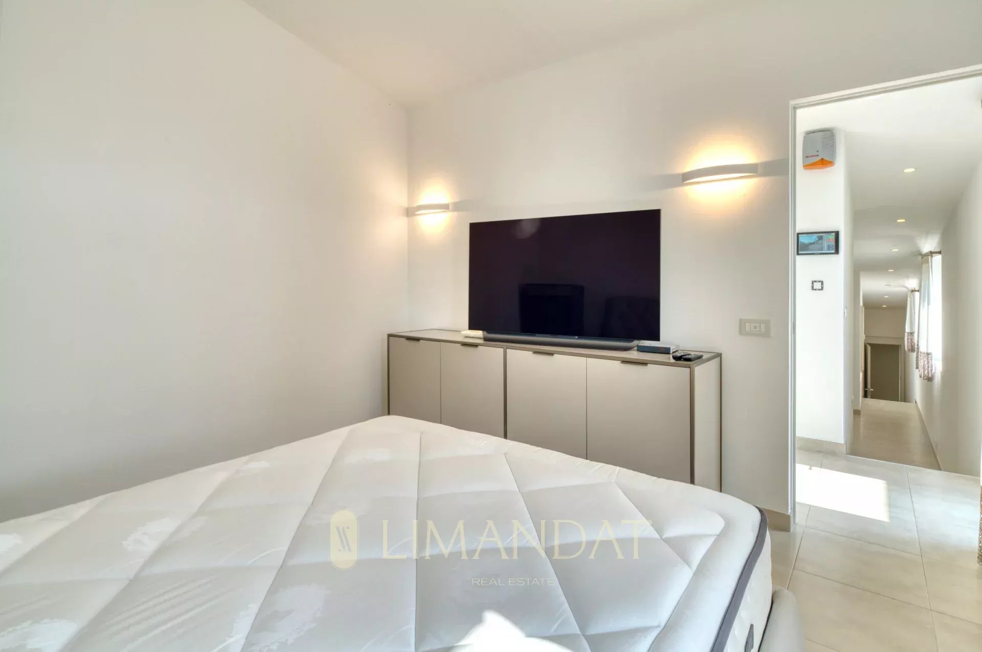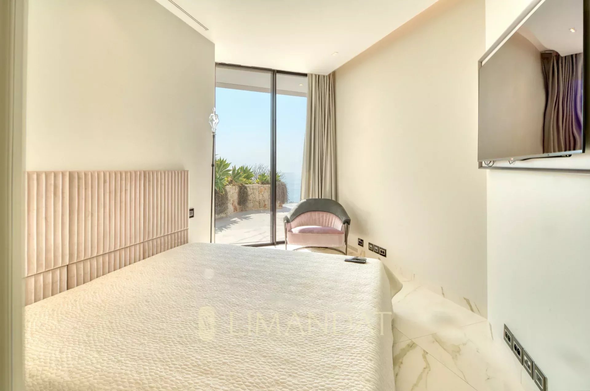 À l’étage, la suite principale dispose d’un dressing, d’un salon privé, d’une grande salle de bains et d’une terrasse avec vue sur la mer. Une seconde chambre en suite complète ce niveau.