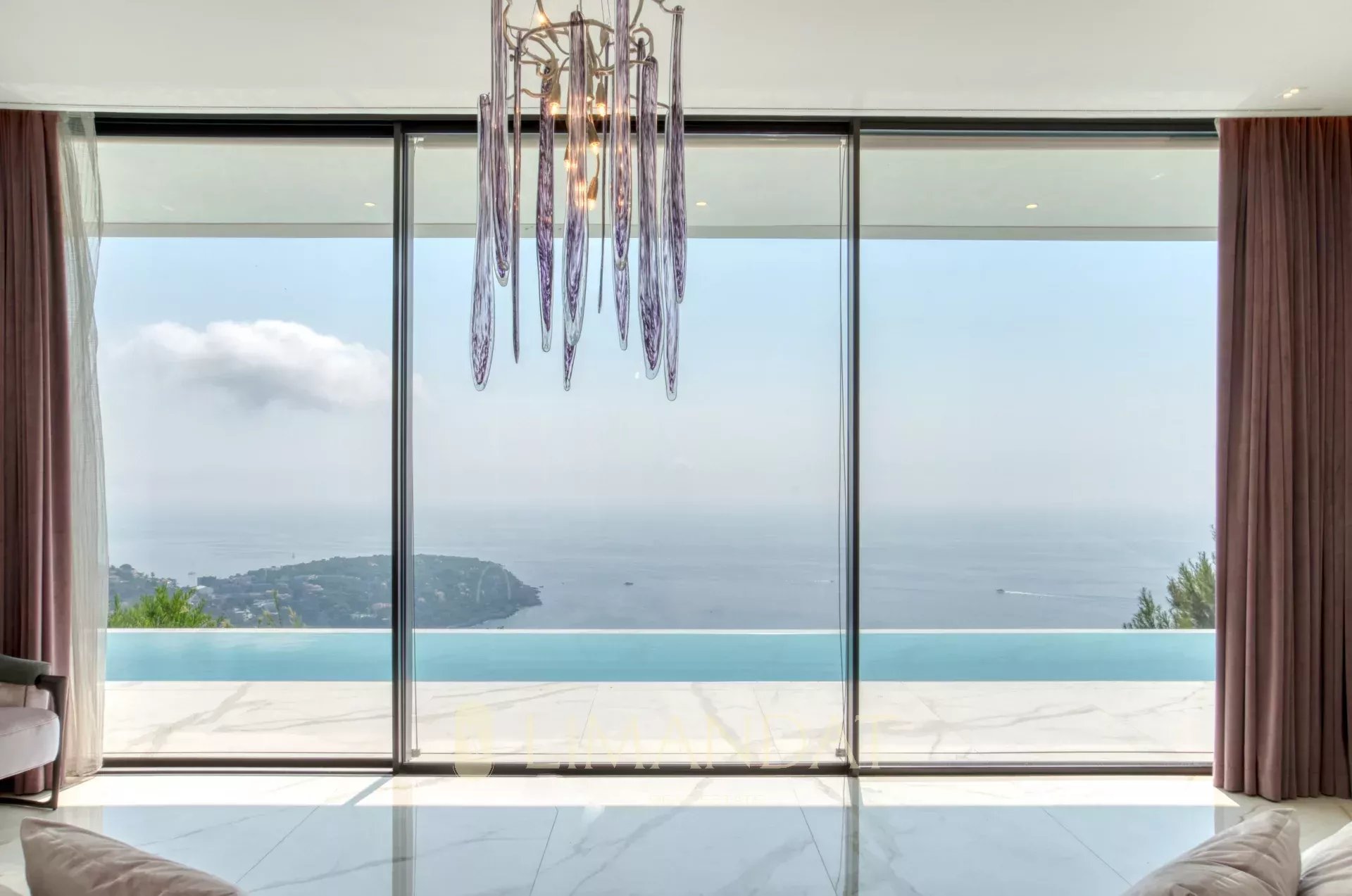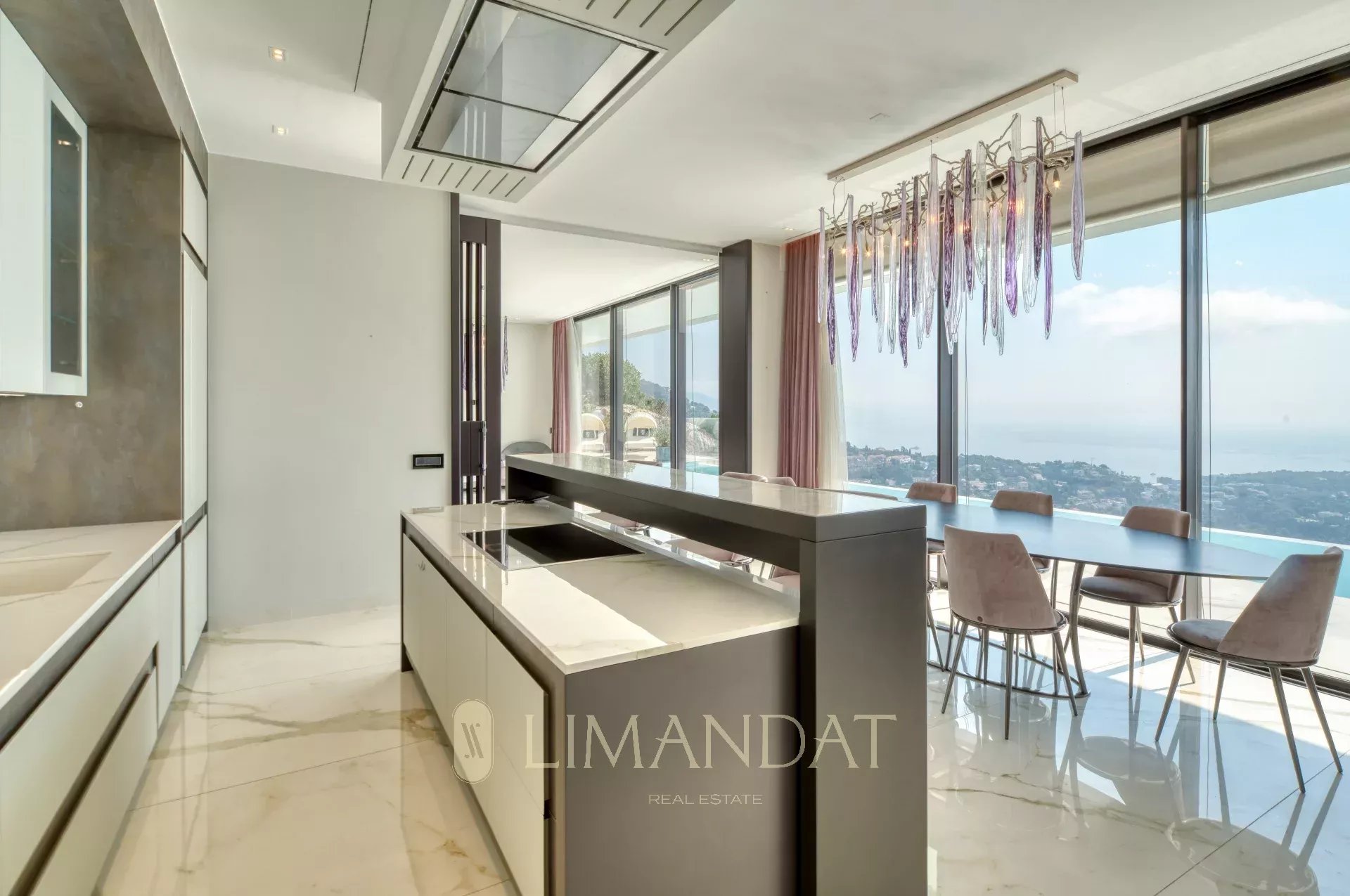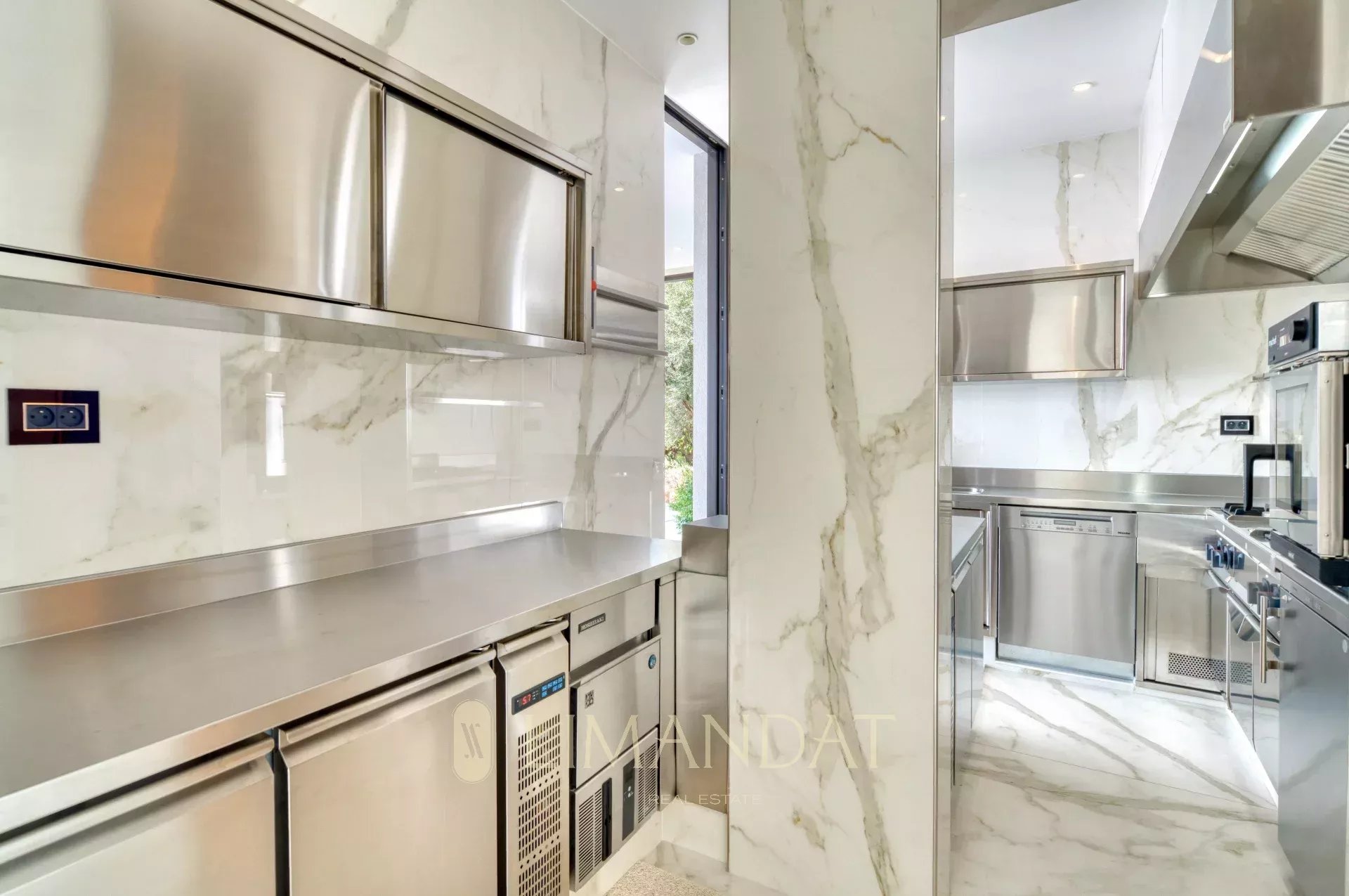 Dès l’entrée, un grand espace de vie s’ouvre sur l’extérieur grâce aux larges baies vitrées. Le salon, la salle à manger et la cuisine équipée donnent directement sur la terrasse principale, où se trouve une piscine à débordement chauffée. Une seconde cuisine professionnelle permet de préparer les repas en toute discrétion.