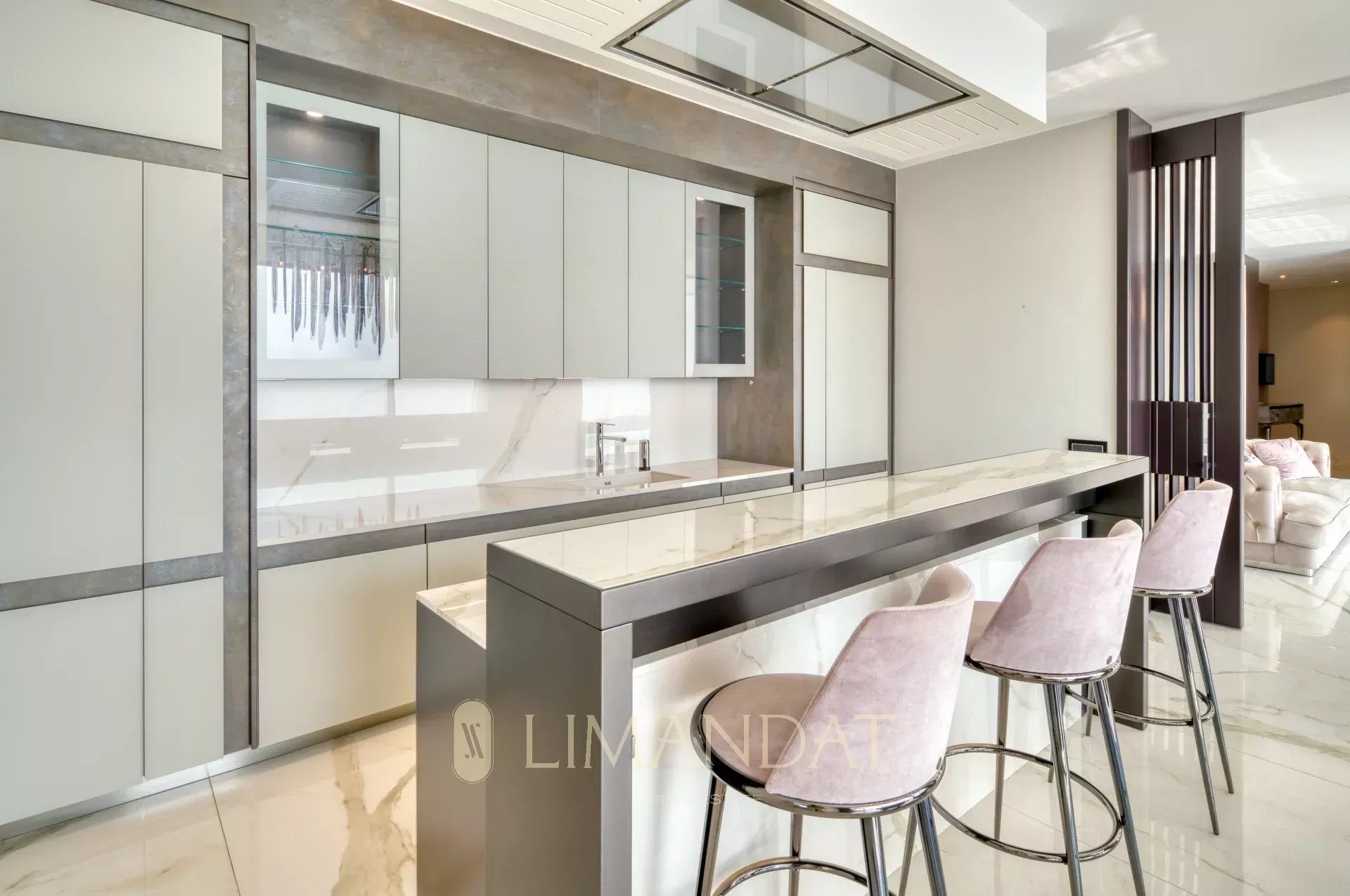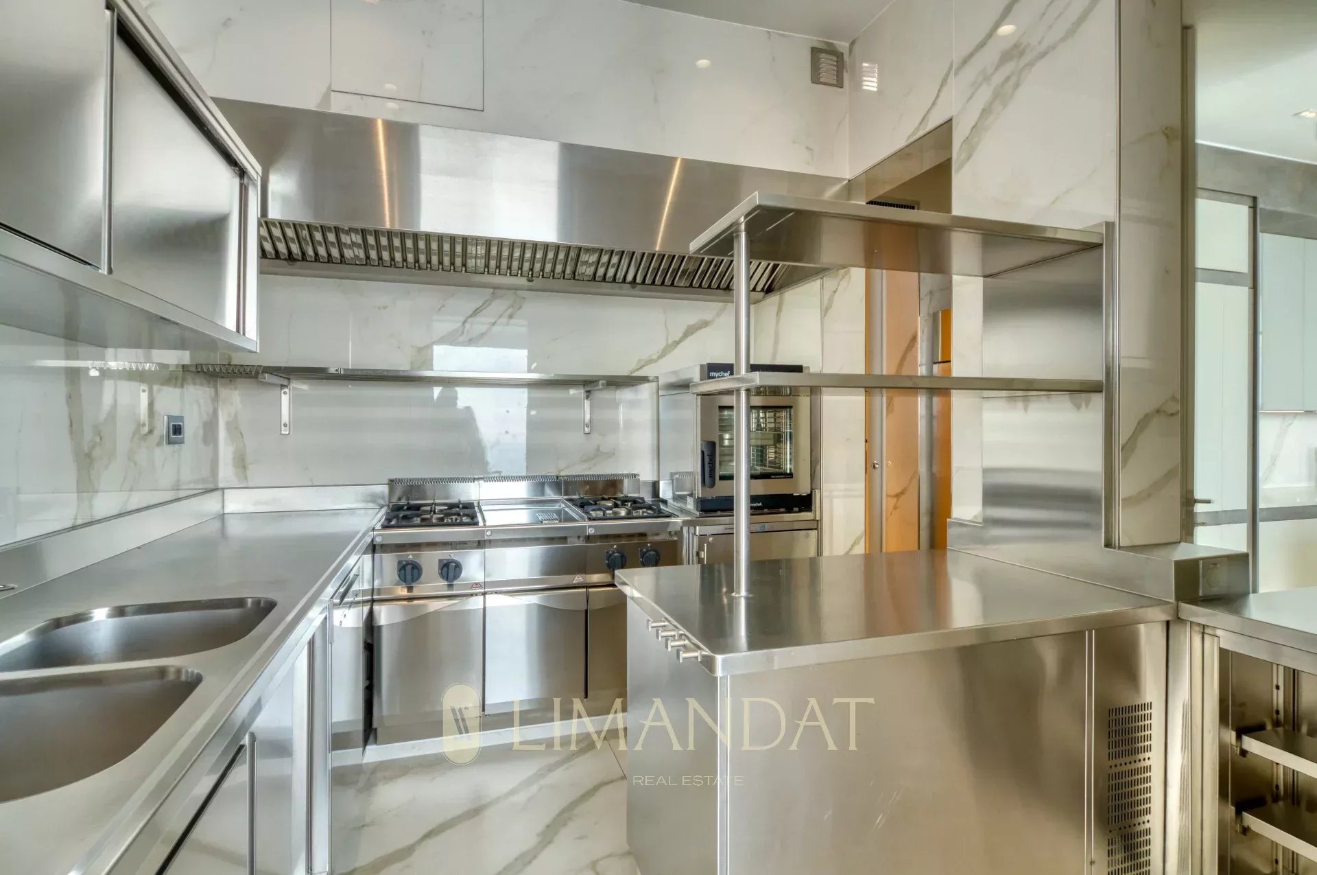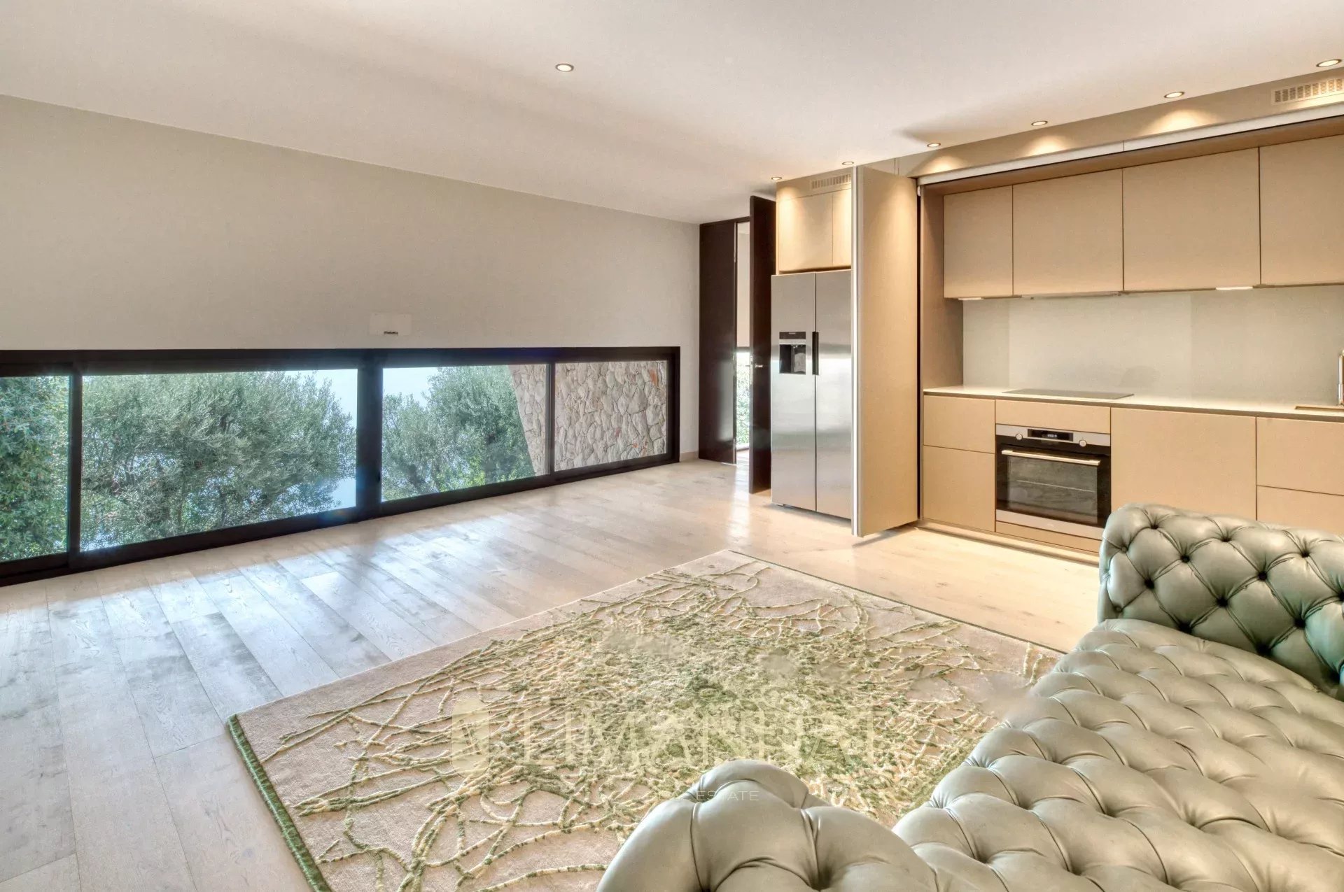 Dès l’entrée, un grand espace de vie s’ouvre sur l’extérieur grâce aux larges baies vitrées. Le salon, la salle à manger et la cuisine équipée donnent directement sur la terrasse principale, où se trouve une piscine à débordement chauffée. Une seconde cuisine professionnelle permet de préparer les repas en toute discrétion.