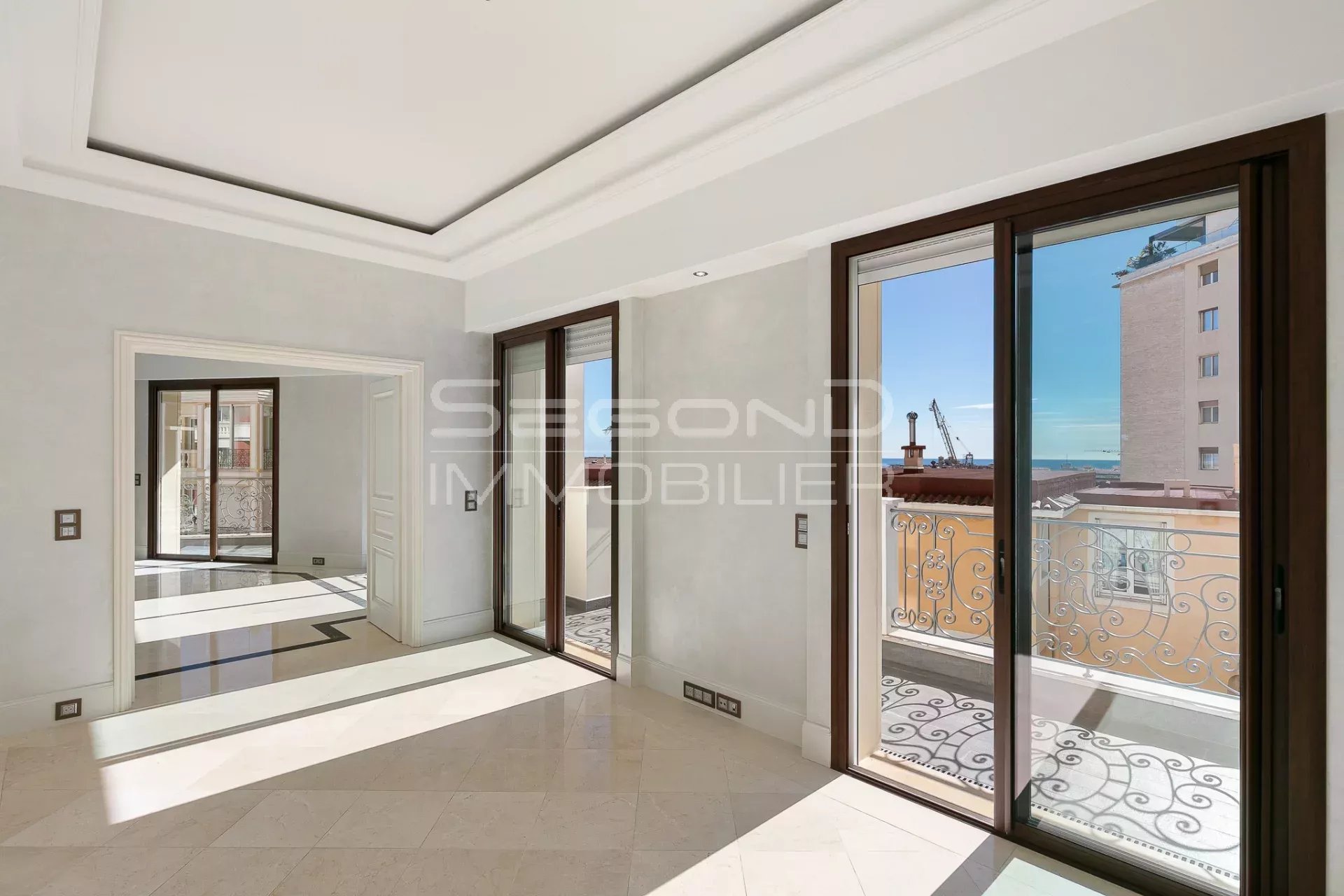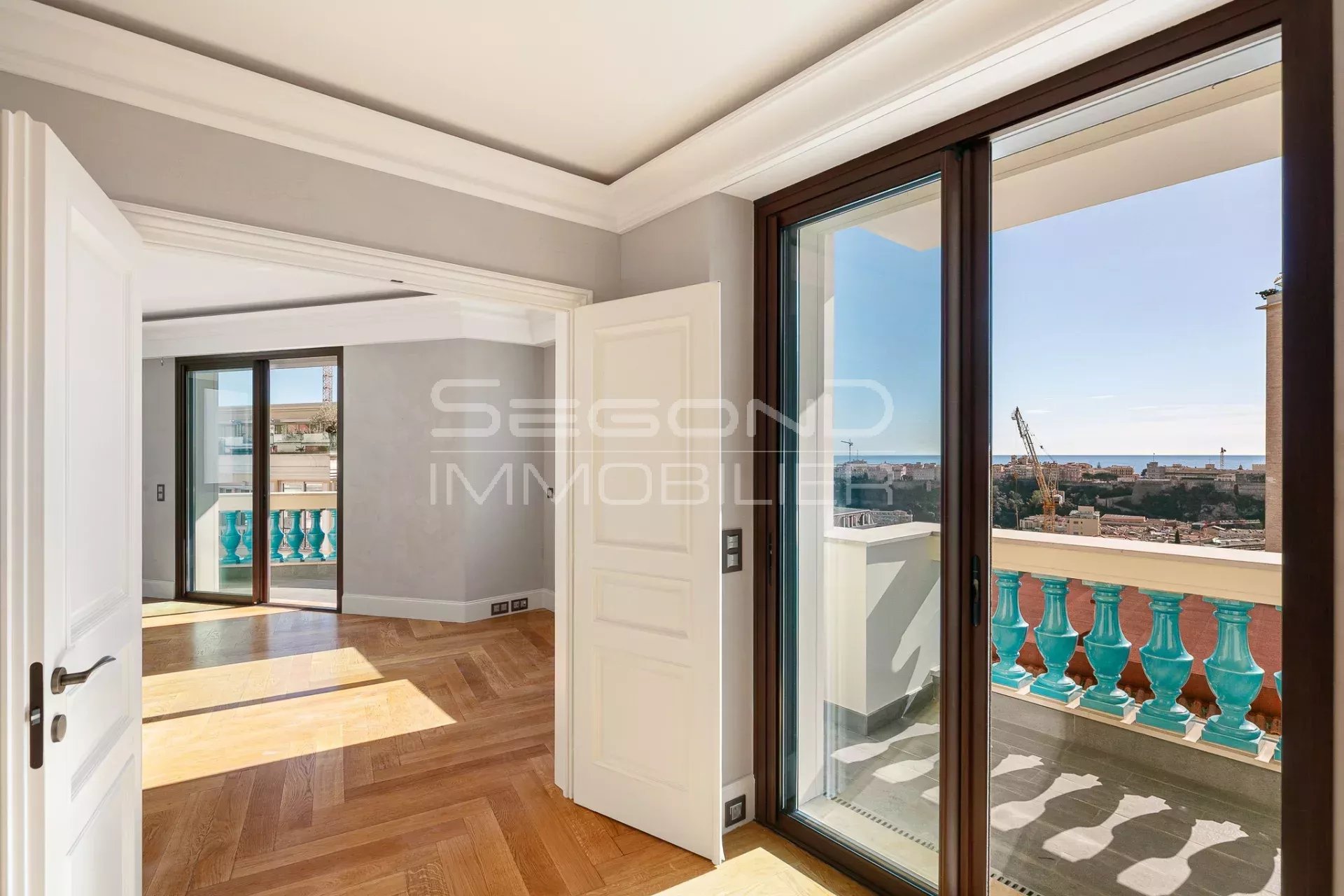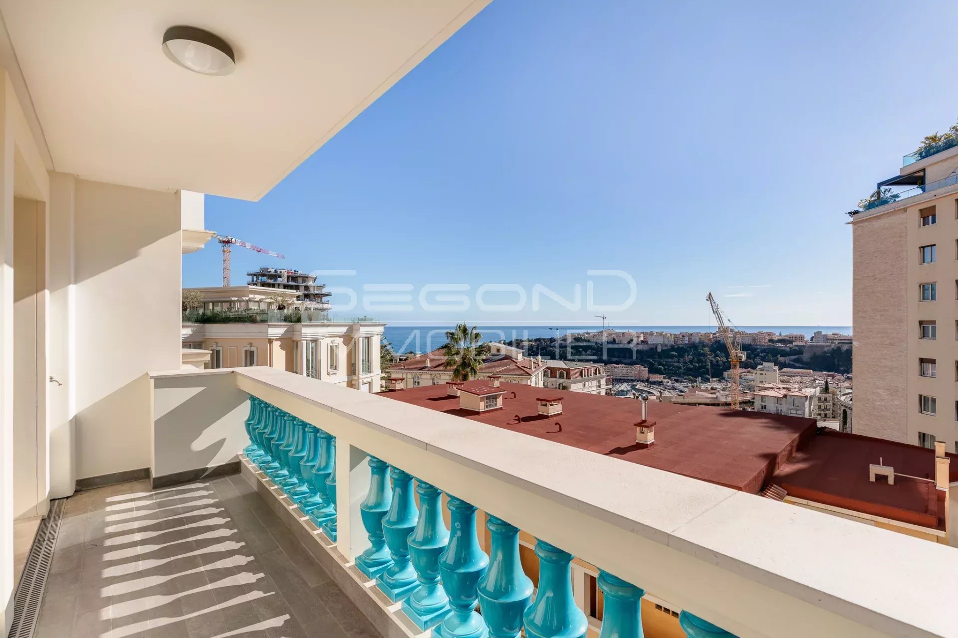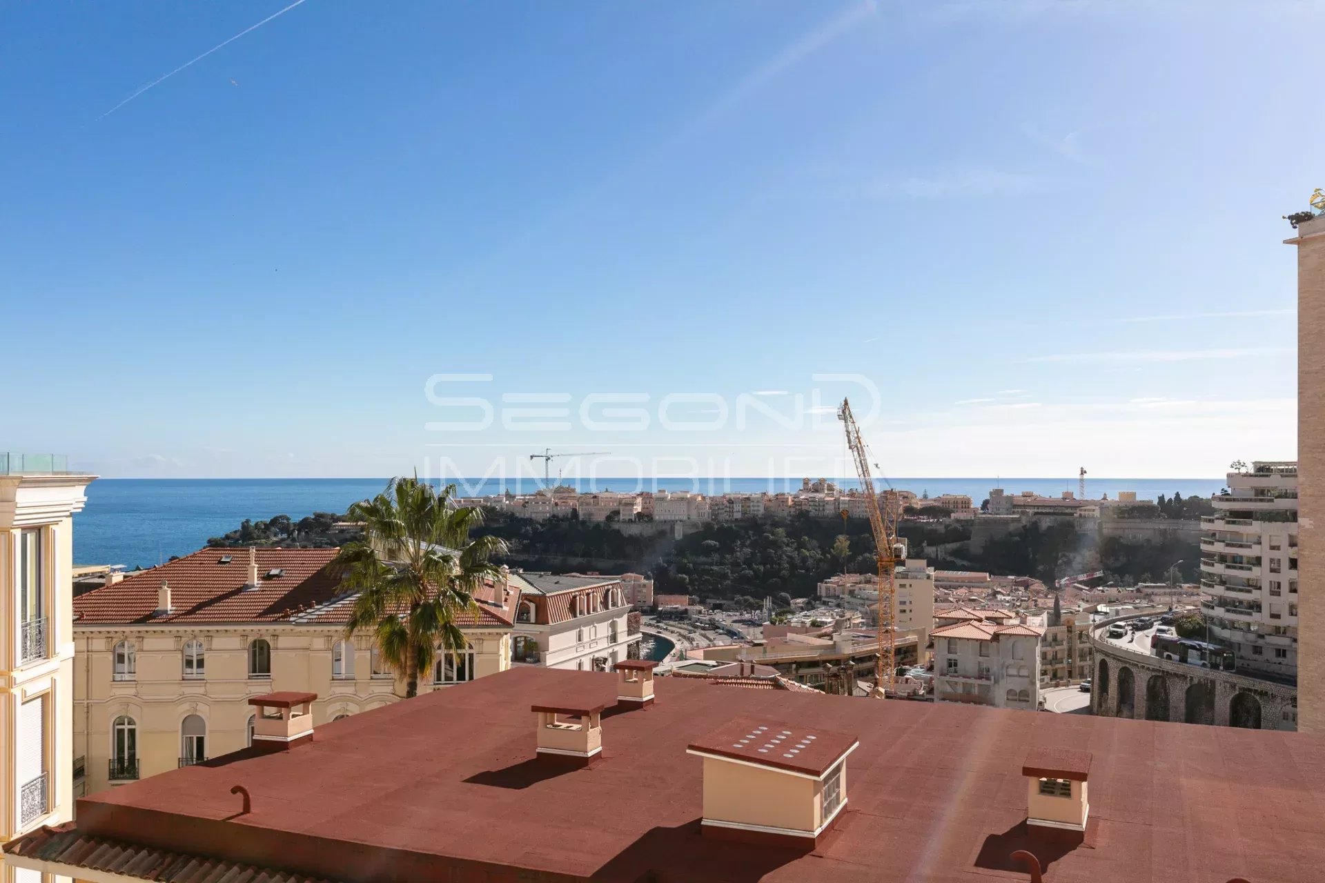Completamente ristrutturato, l'appartamento è molto luminoso grazie alla sua tripla esposizione e alle numerose vetrate, che offrono una vista panoramica sul Principato, sulla sua rocca e sul Mediterraneo.