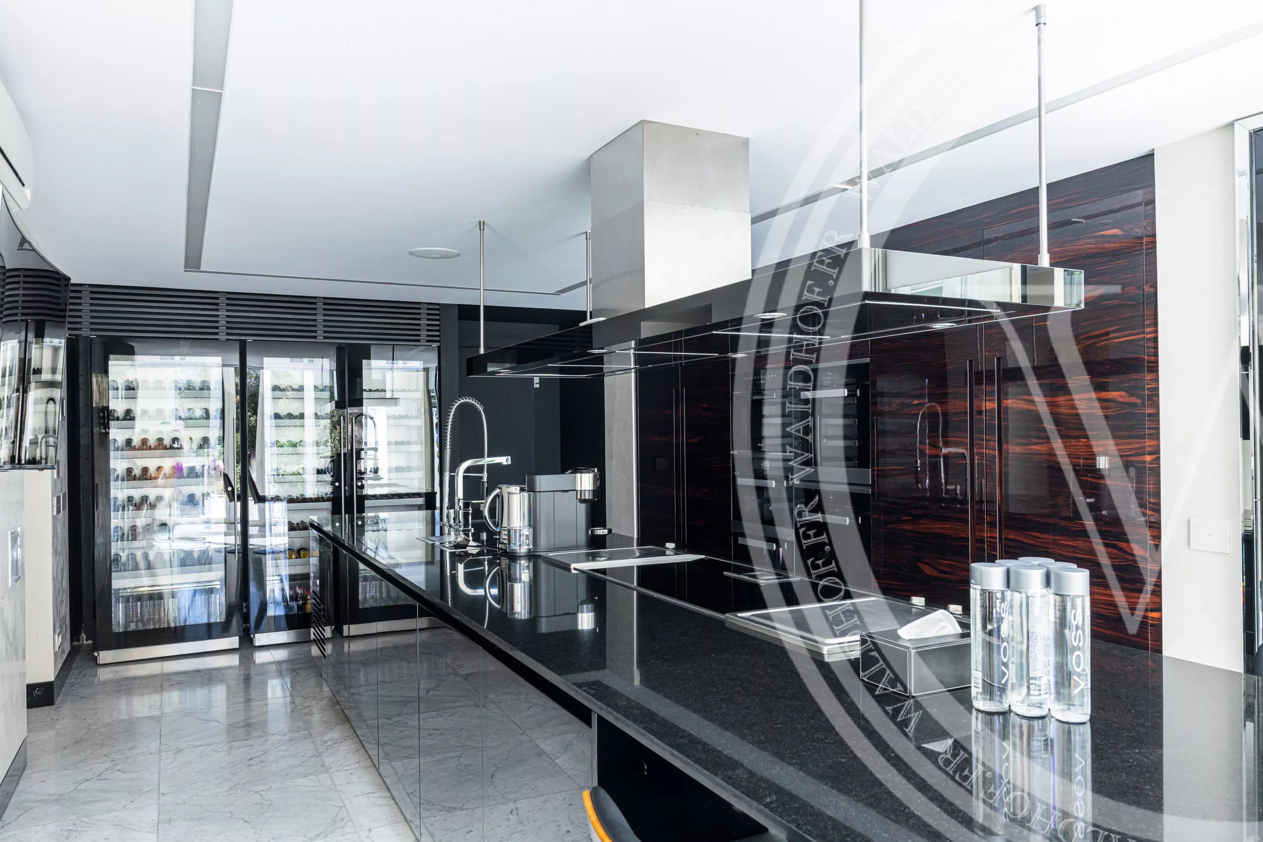 La cucina professionale 'Boffi' è dotata di cella frigorifera (equivalente a 6 frigoriferi), piano cottura giapponese per cucina teppanyaki, piano cottura normale, scaldapiatti, coperture per 24, due lavastoviglie, due forni, microonde e macchina per il caffè e cantinetta vino Viking per 200 bottiglie. C'è anche un barbecue a gas Viking di grandi dimensioni fuori dalla cucina.