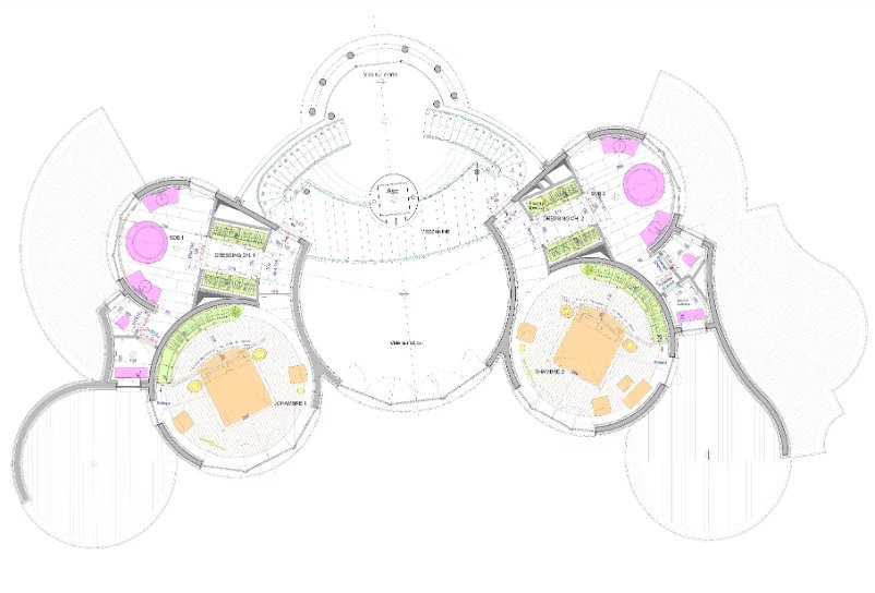 Il livello inferiore comprende un'area multifunzionale di 140 m², una lavanderia, un magazzino e un ufficio per il personale con bagno privato. È presente anche un parcheggio privato per sei auto.