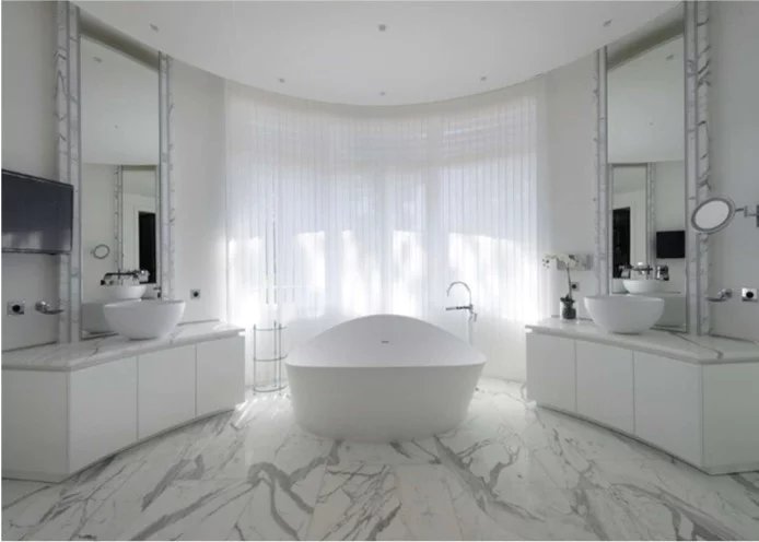 Al primo piano si trovano altre due camere da letto con bagno privato, spogliatoi e terrazze.