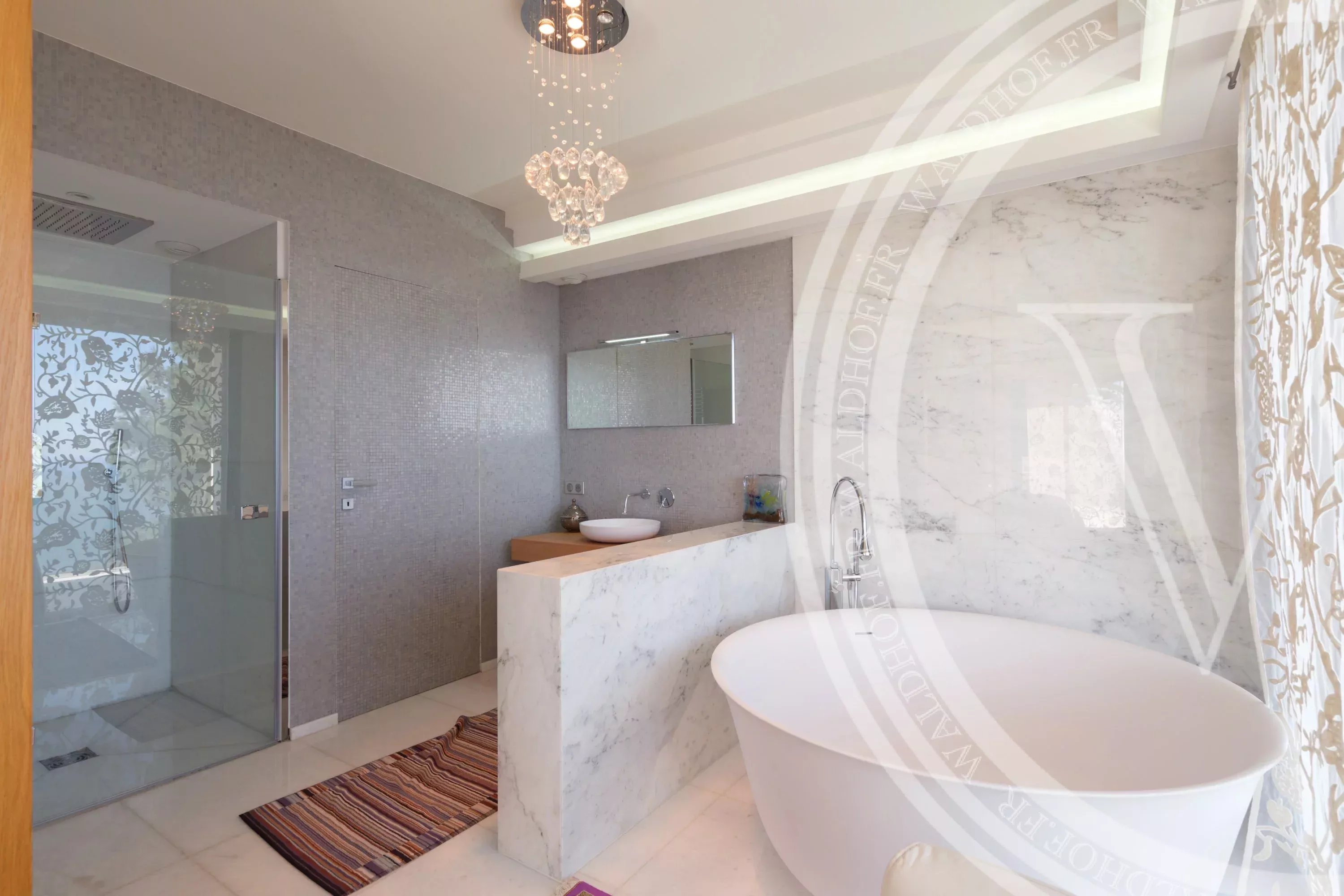 Un padiglione fitness di design con pareti in vetro aggiunge un'attrattiva di benessere, circondato da un lussureggiante giardino pianeggiante con alberi mediterranei maturi. Molteplici spazi per pranzare e cenare all'aperto rendono questa villa ideale per intrattenersi o per ritirarsi in tranquillità.